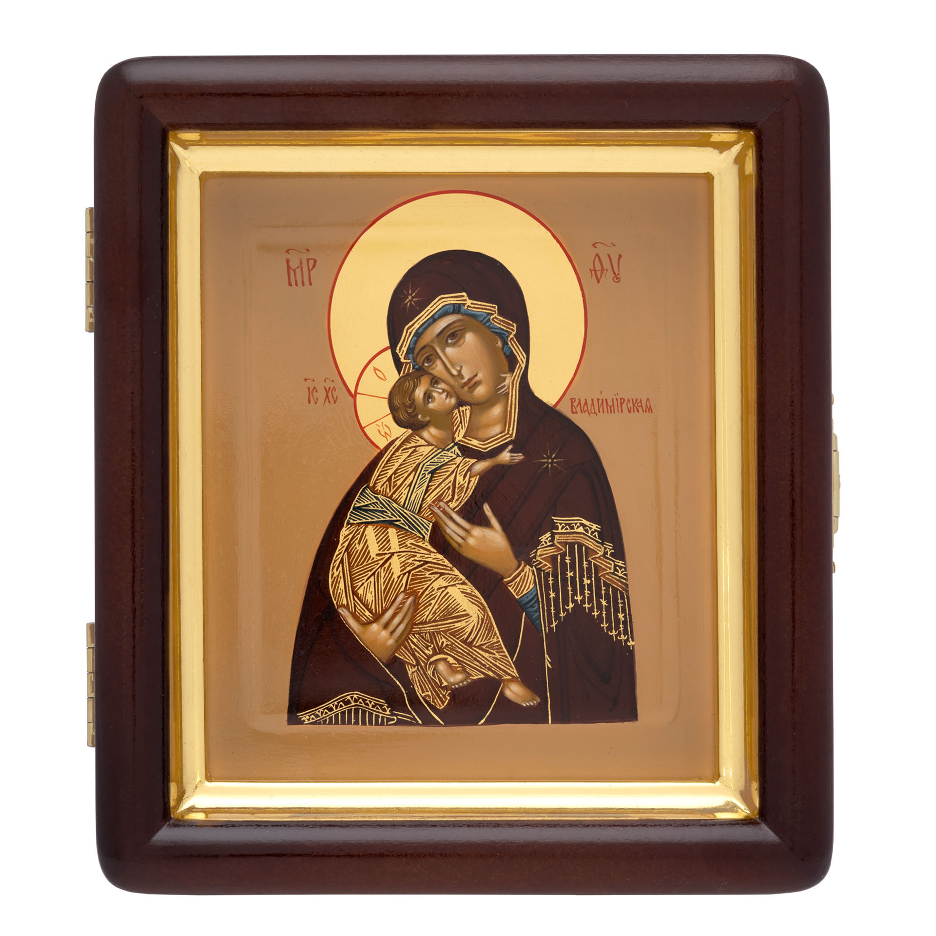 Икона живописная на доске в киоте 11х13 темпера, золоченый нимб, ковчег, киот №1 Владимирская БМ, 01415