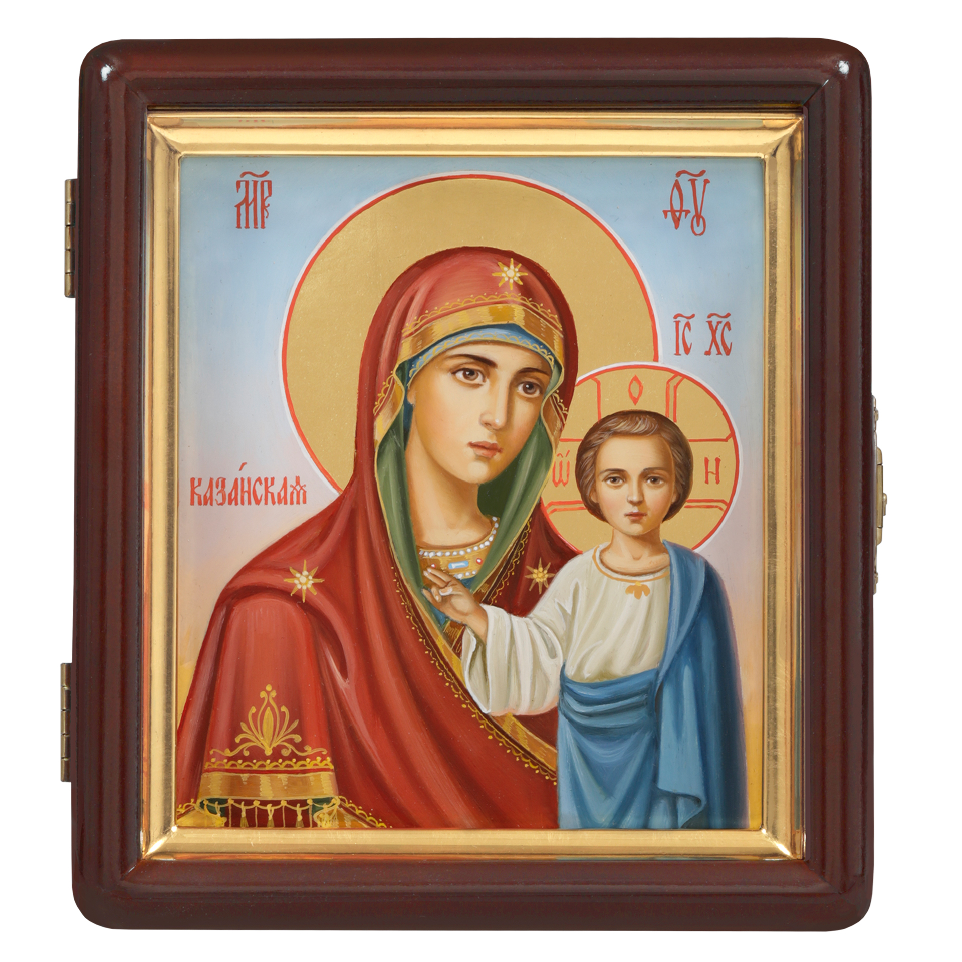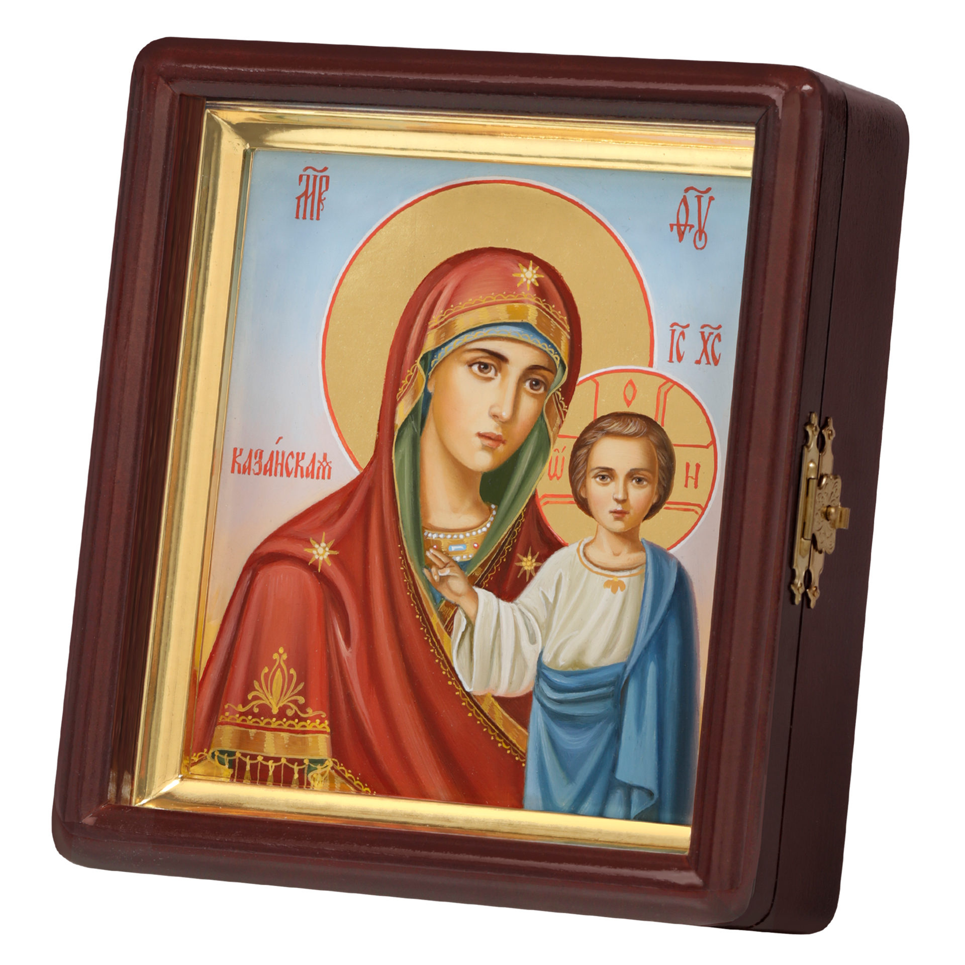 Икона живописная на доске в киоте 13х15 масло, золоченый нимб, киот №1 Казанская БМ, 05229
