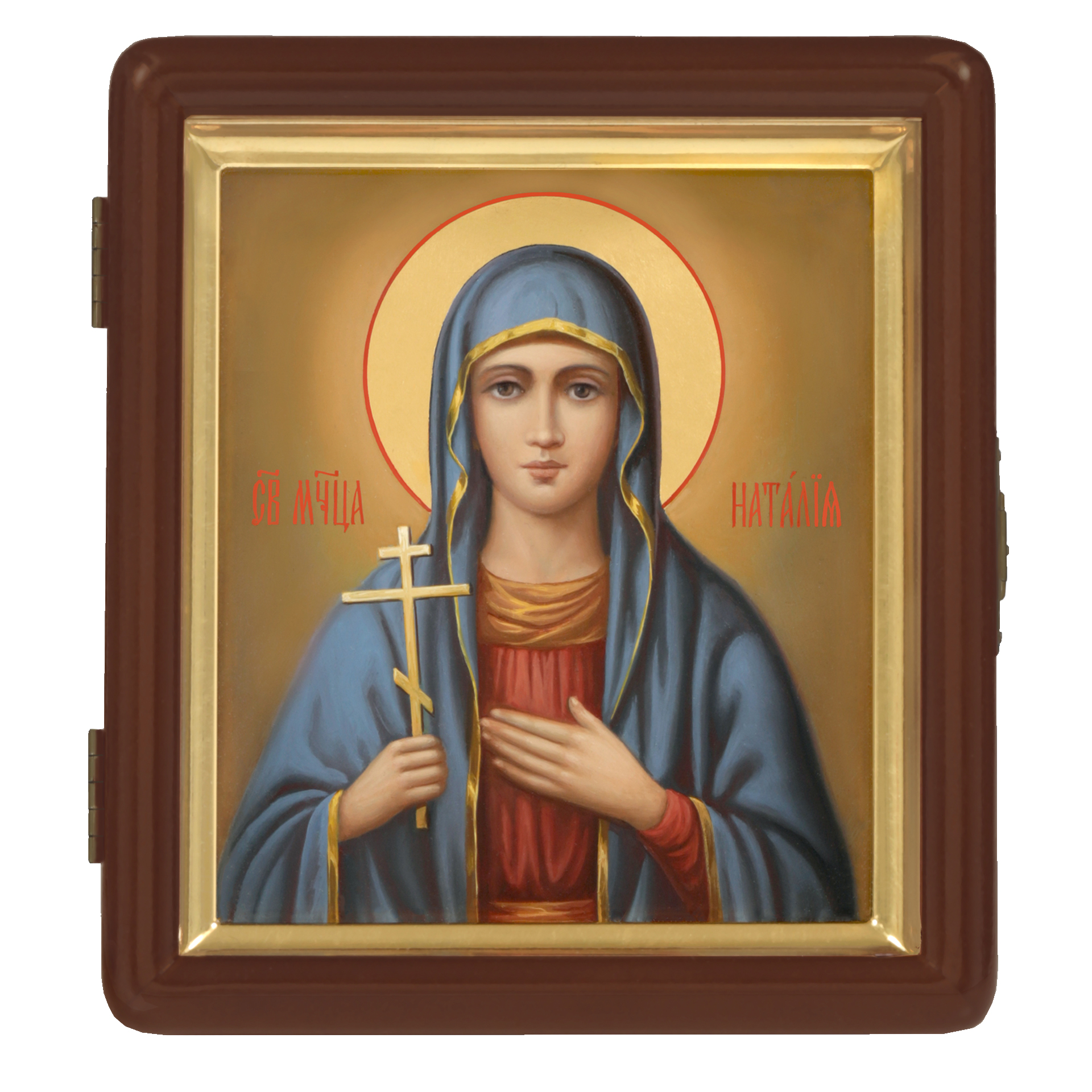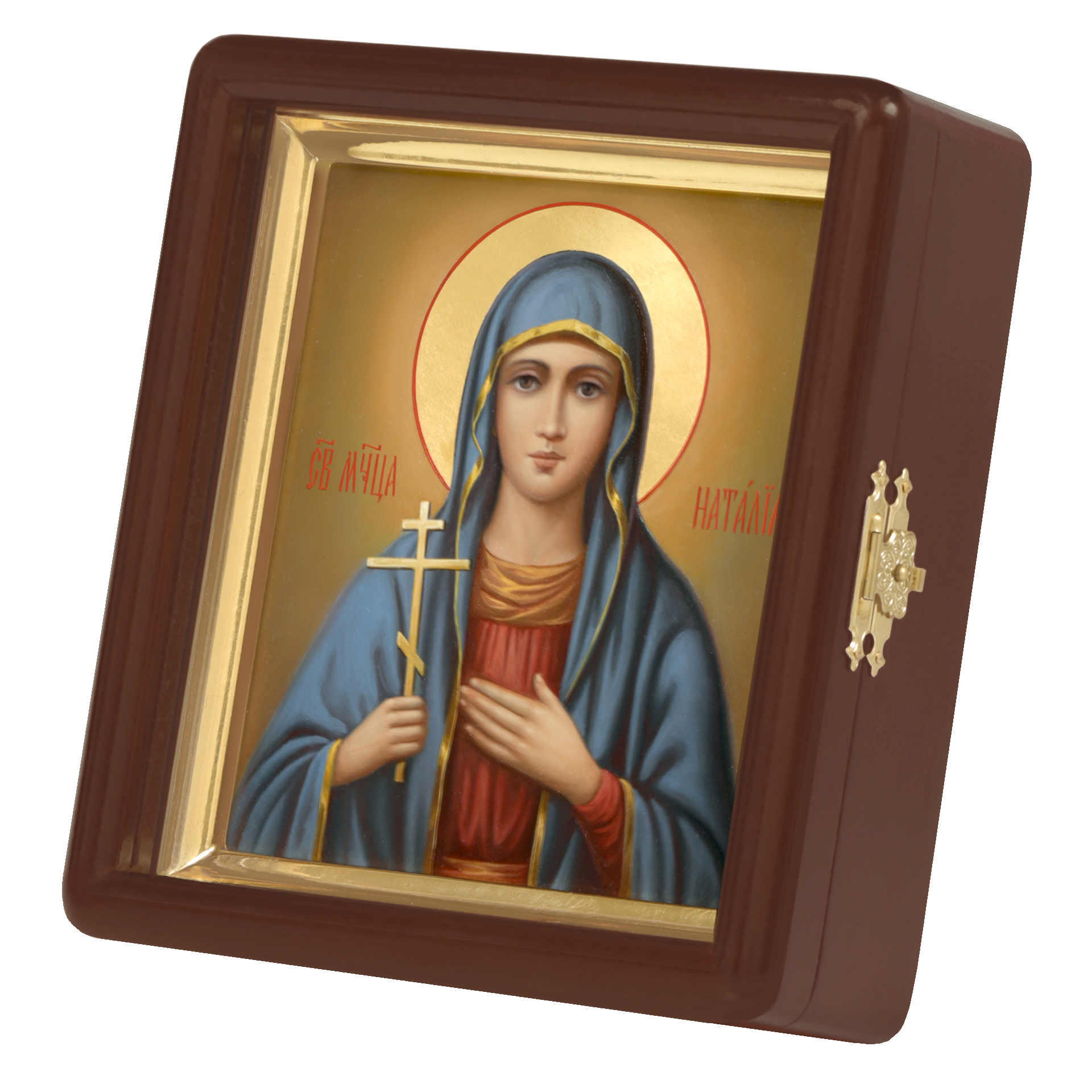 Икона живописная на доске в киоте 13х15 масло, золоченый нимб, киот №1 Наталия, 05576