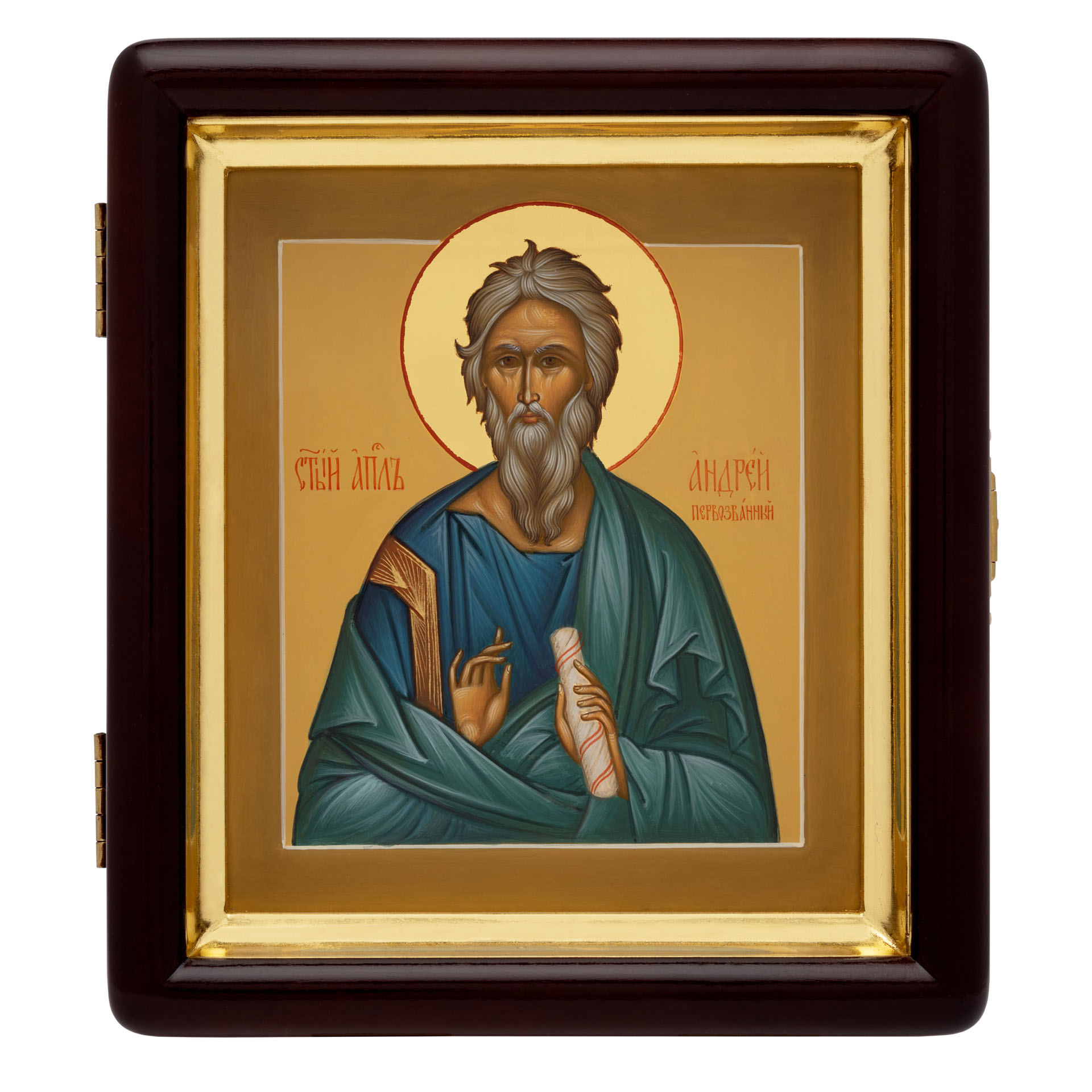 Икона живописная на доске в киоте 13х15 темпера, золоченый нимб, ковчег, киот №1 Андрей Первозванный, 03920