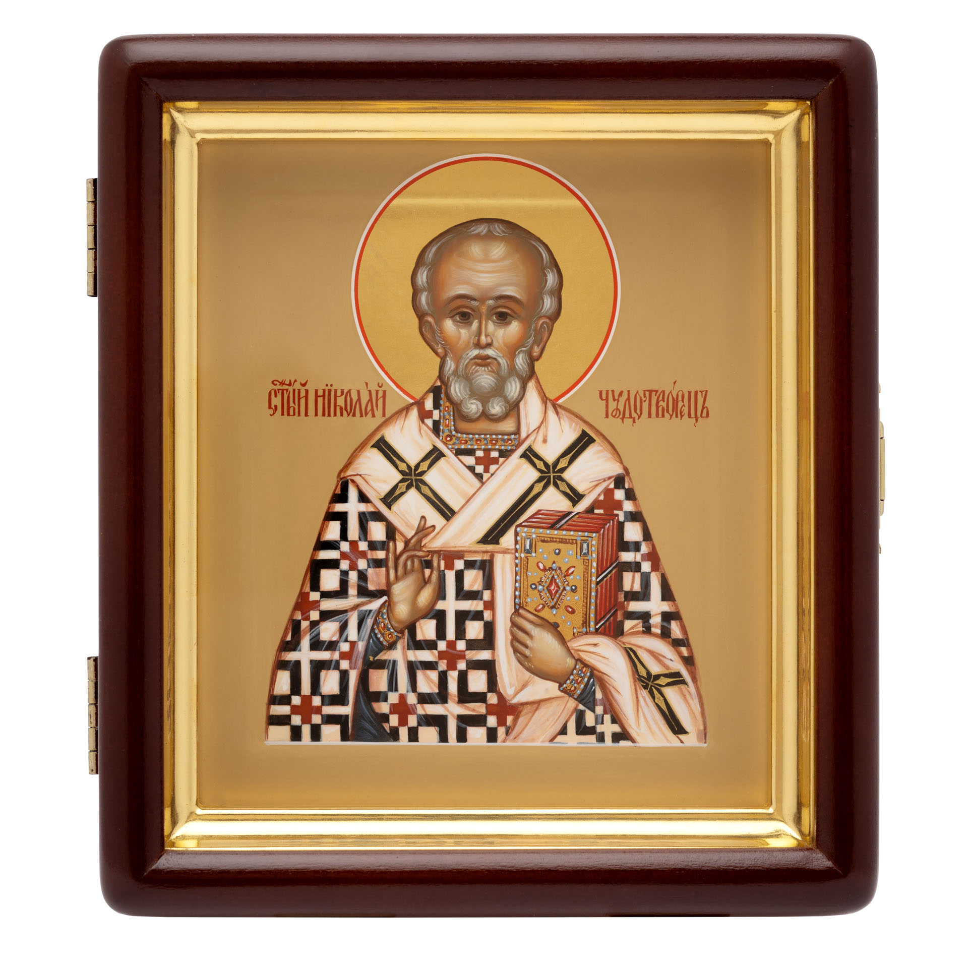 Икона живописная на доске в киоте 13х15 темпера, золоченый нимб, ковчег, киот №1 Николай Чудотворец, 02126