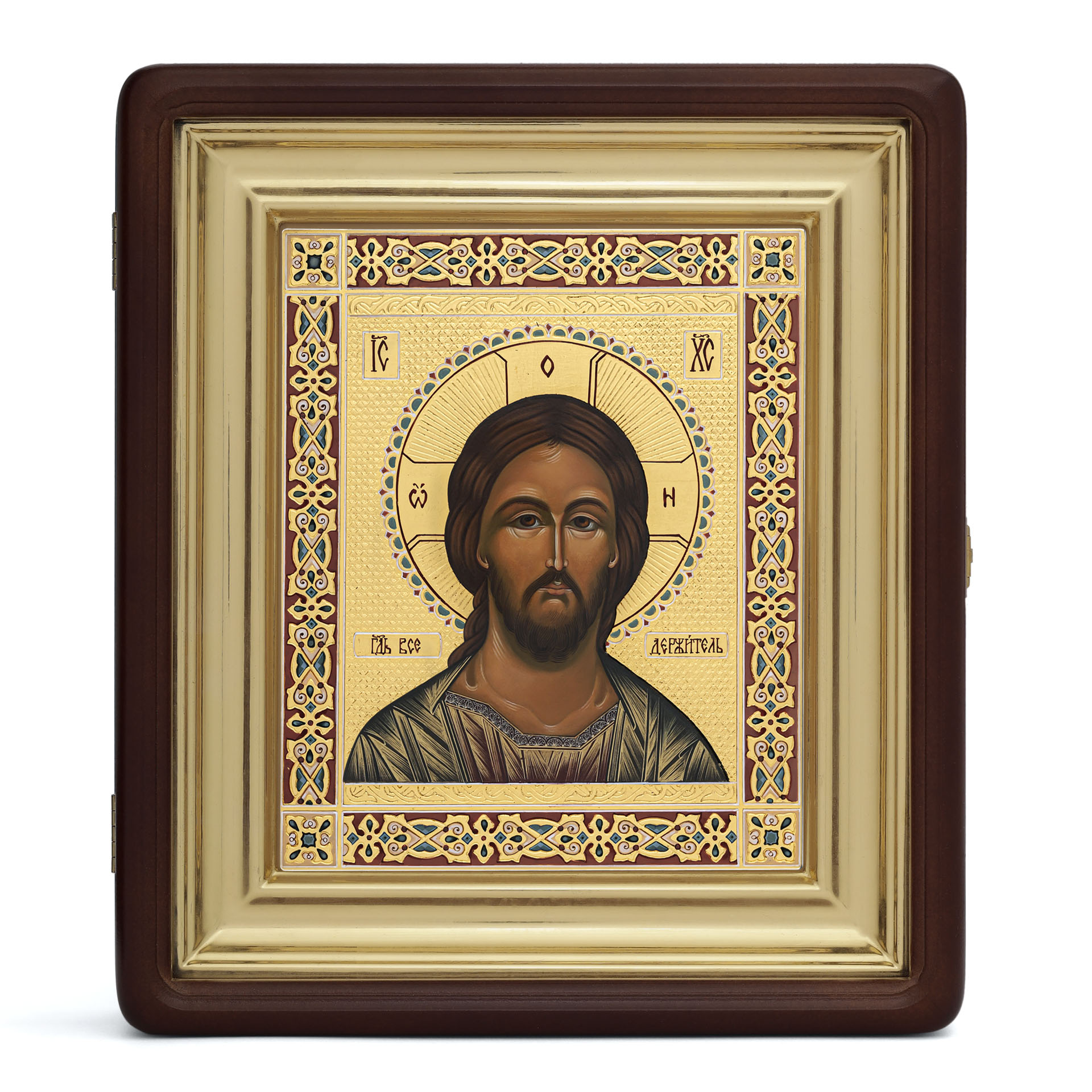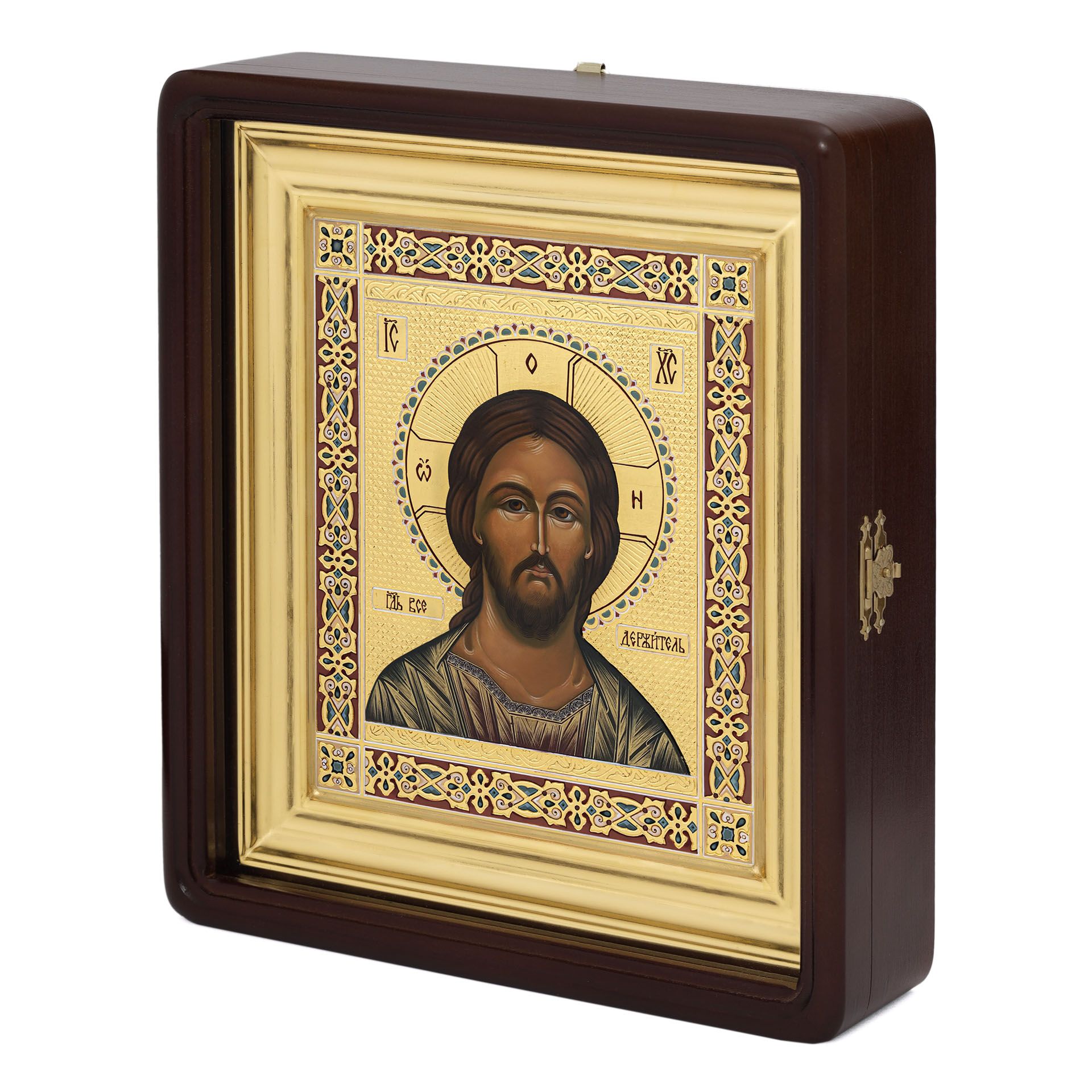 Икона живописная на доске в киоте 18х24 масло, чеканный золоченый фон, эмаль, киот №1 Спаситель