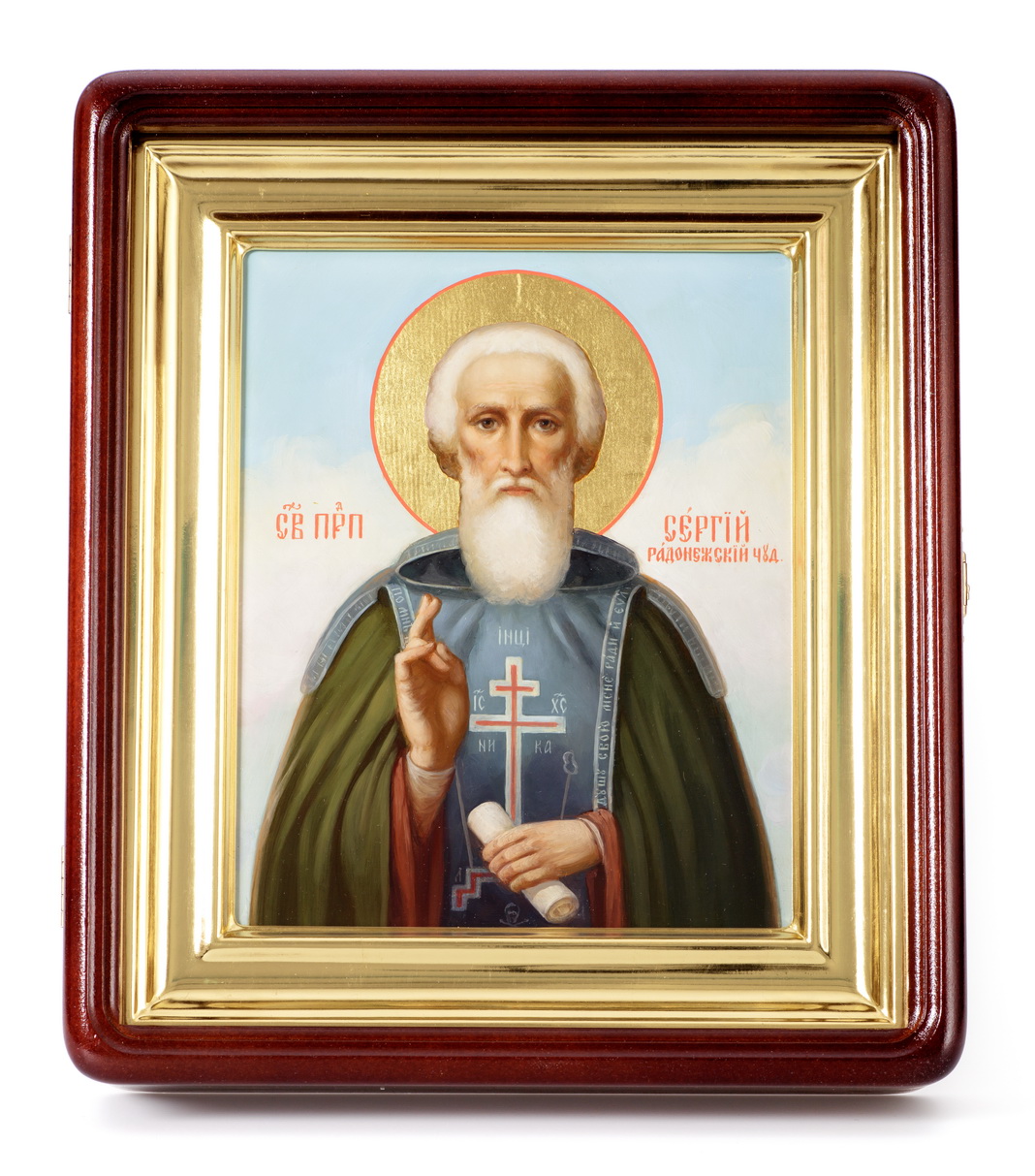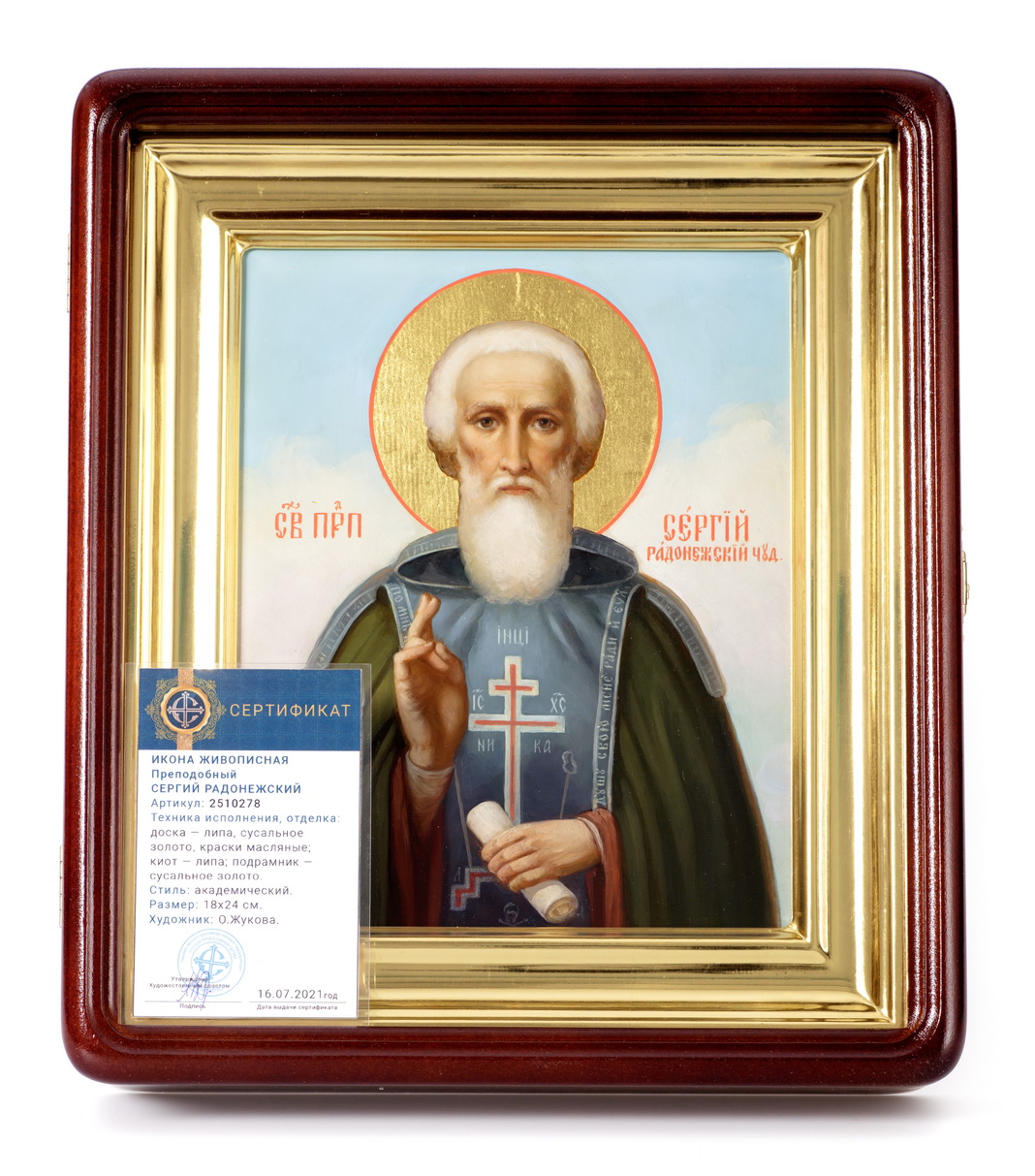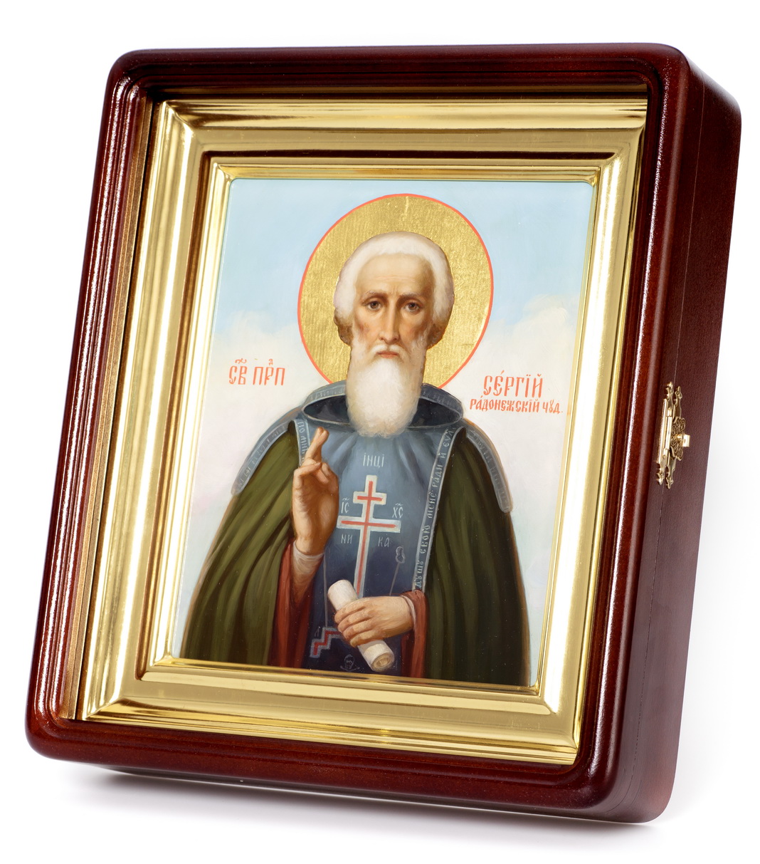 Икона живописная на доске в киоте 18х24 масло, золоченый нимб, киот №1 Сергий Радонежский