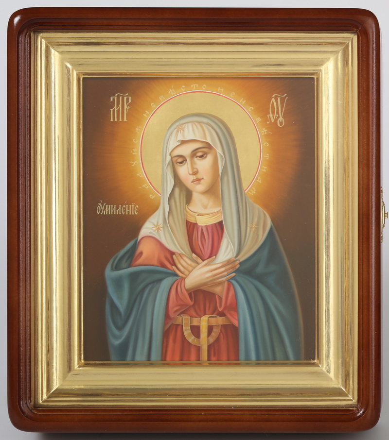 Икона живописная на доске в киоте 18х24 масло, золоченый нимб, киот №1 Умиление БМ