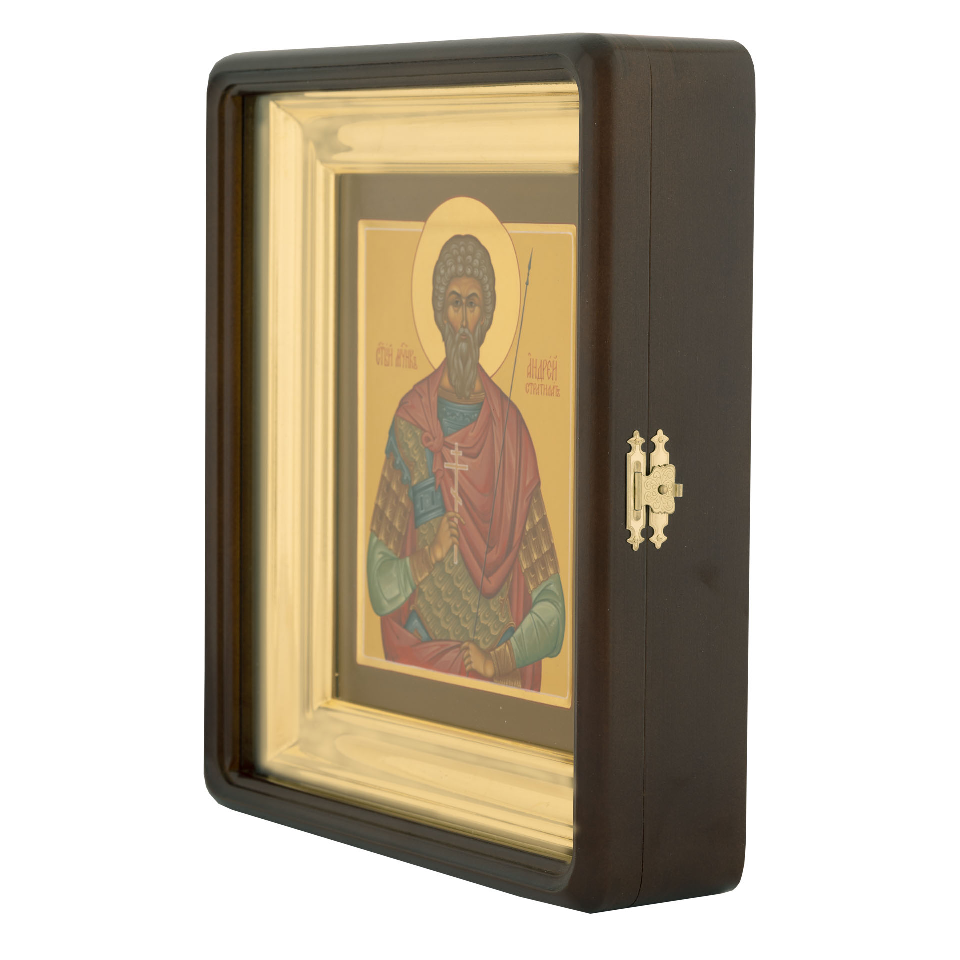 Икона живописная на доске в киоте 18х24 темпера, золоченый нимб, ковчег, киот №1 Андрей Стратилат, 01214