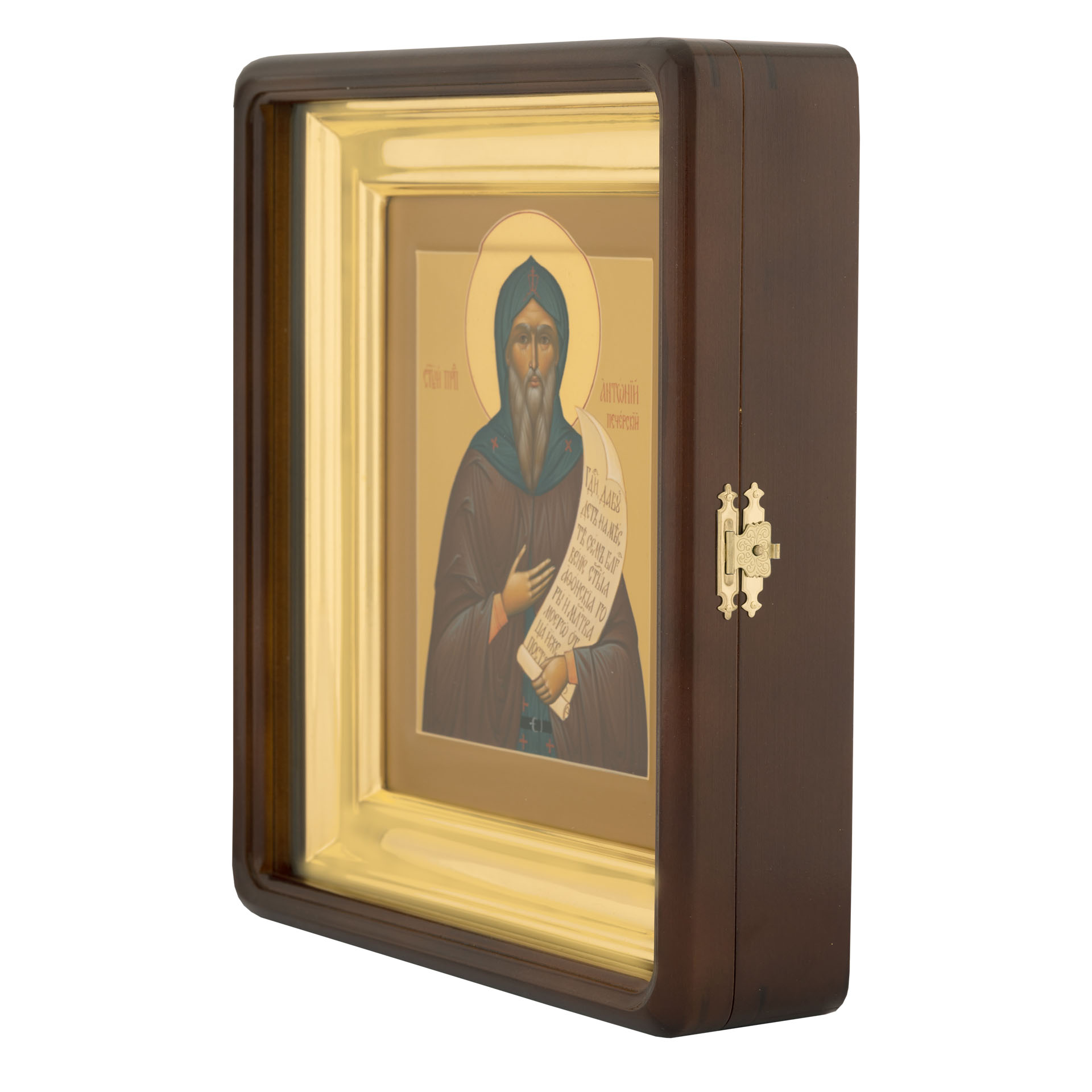 Икона живописная на доске в киоте 18х24 темпера, золоченый нимб, ковчег, киот №1 Антоний Печерский, 02365
