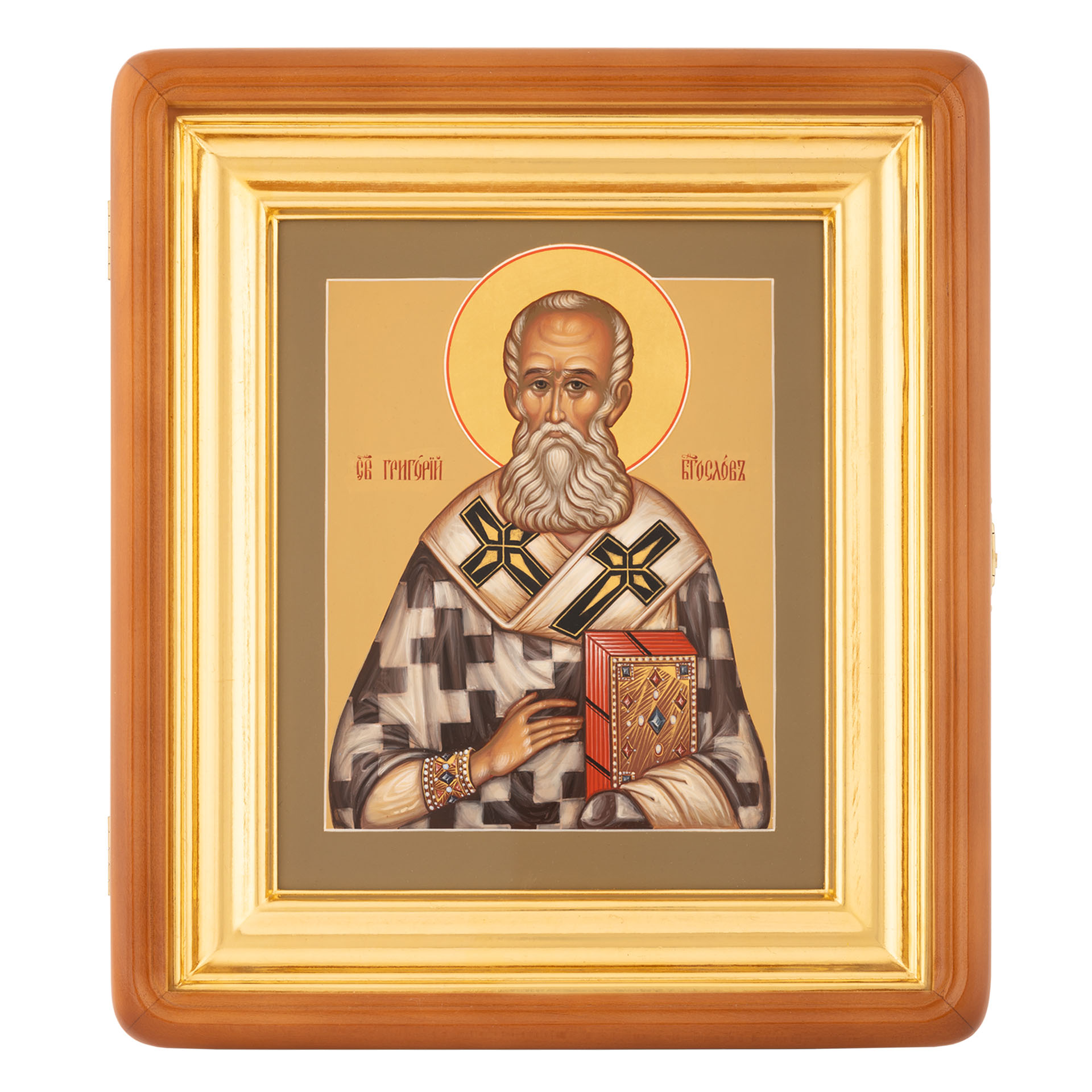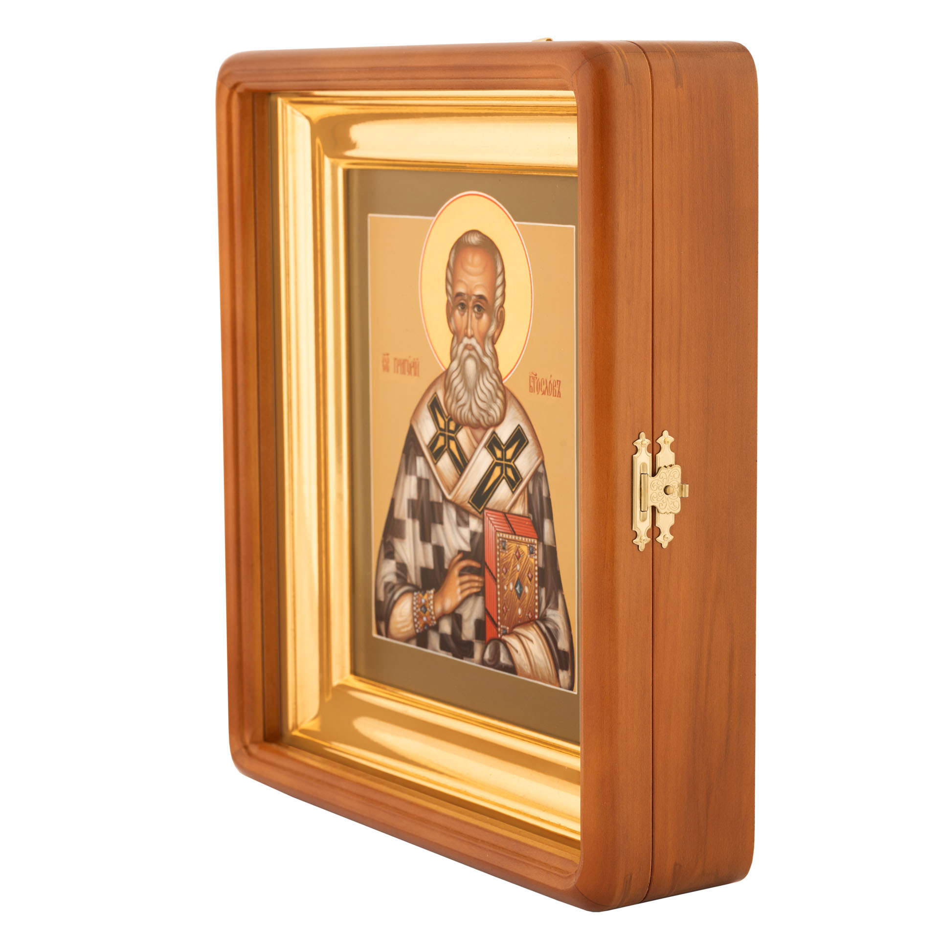 Икона живописная на доске в киоте 18х24 темпера, золоченый нимб, ковчег, киот №1 Григорий Богослов, 00597