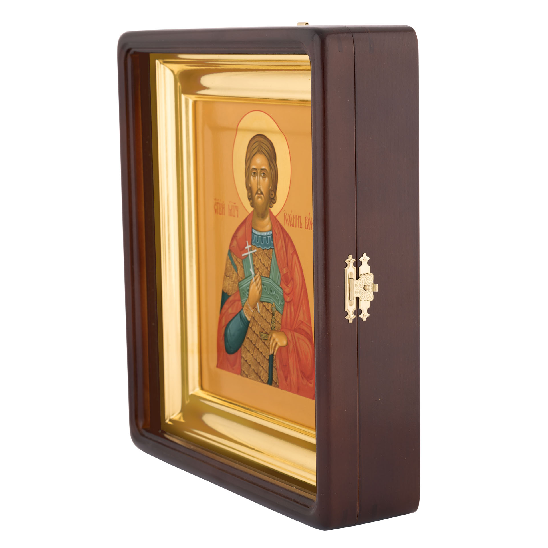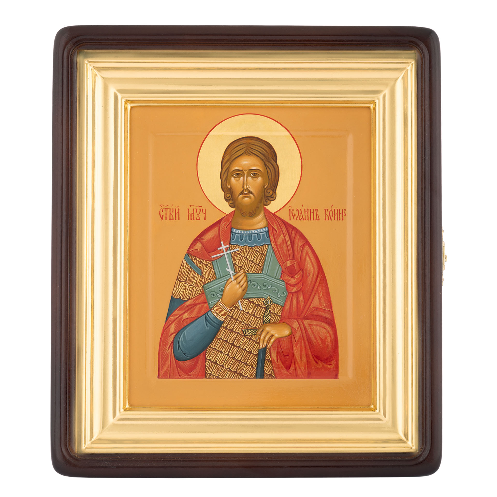 Икона живописная на доске в киоте 18х24 темпера, золоченый нимб, ковчег, киот №1 Иоанн Воин, 02704