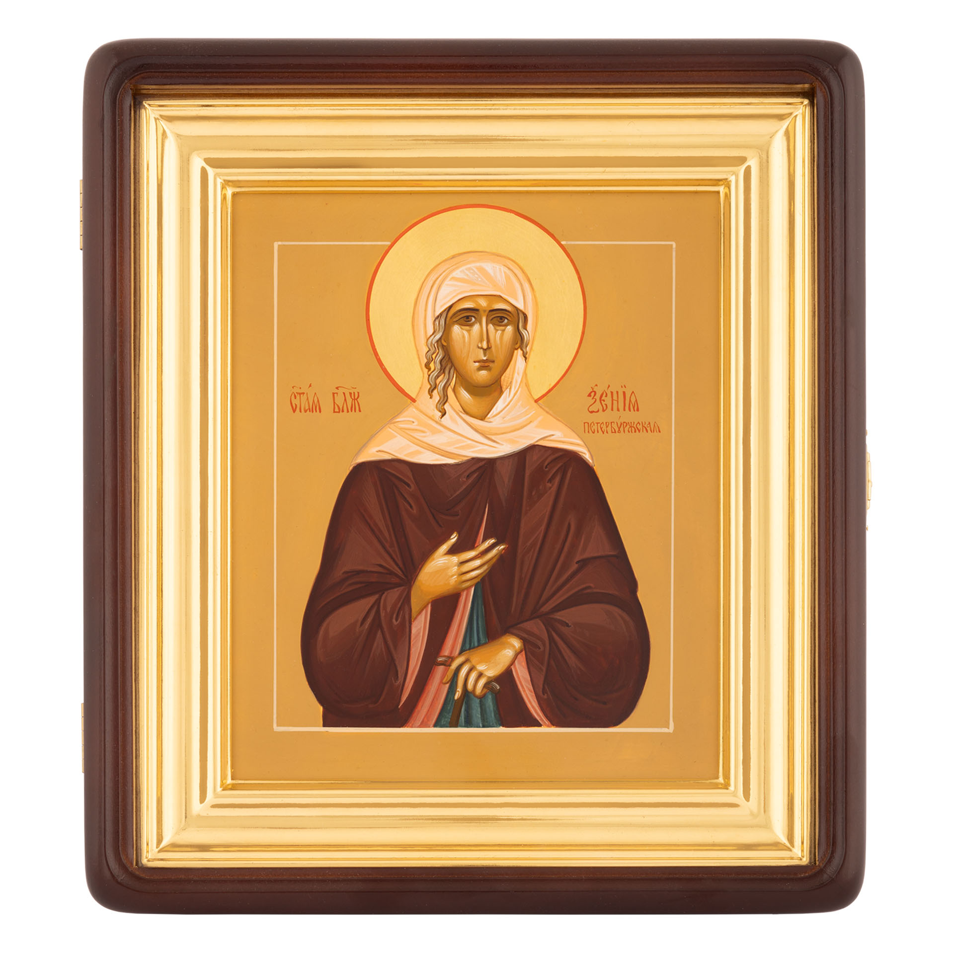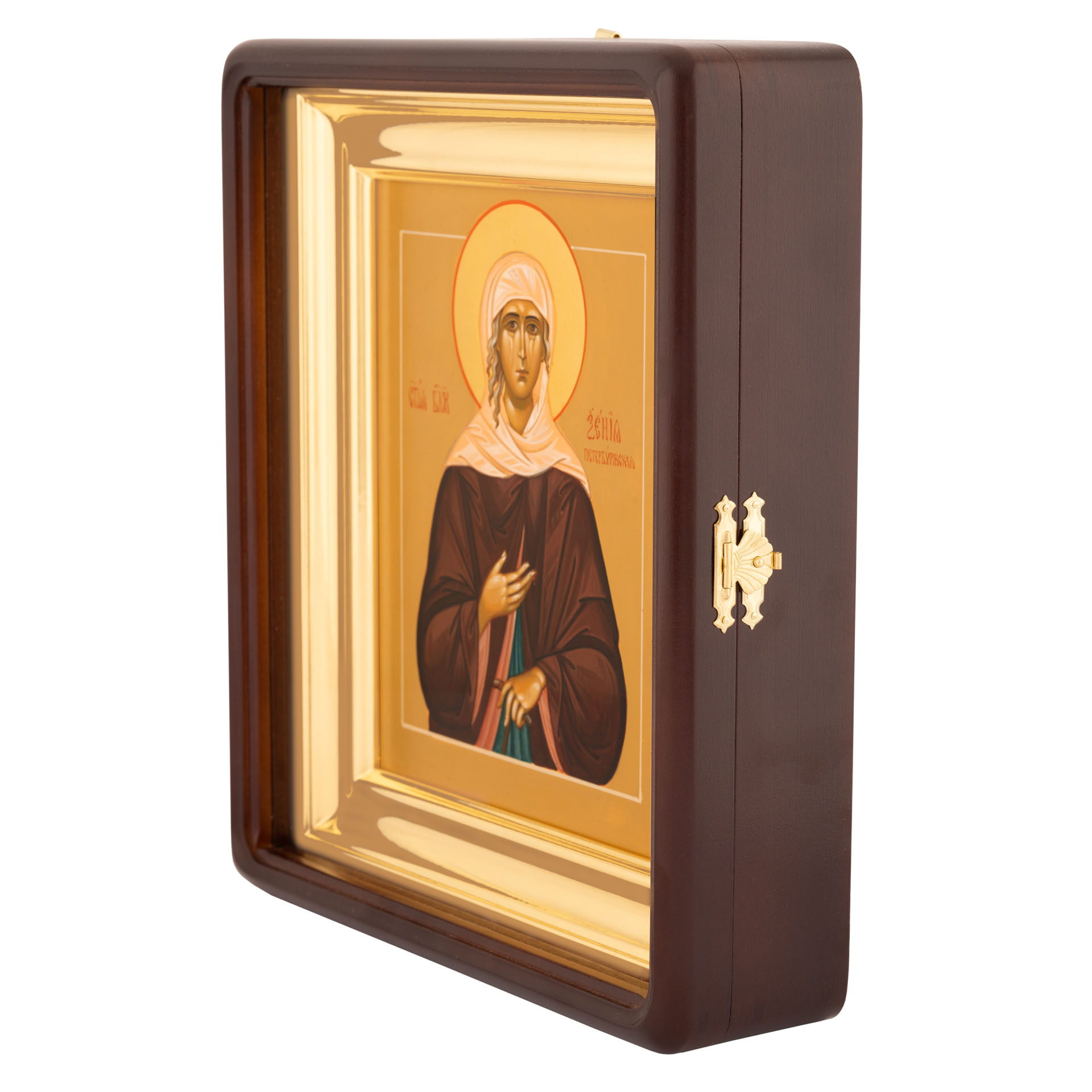 Икона живописная на доске в киоте 18х24 темпера, золоченый нимб, ковчег, киот №1 Ксения Петербургская, 01796