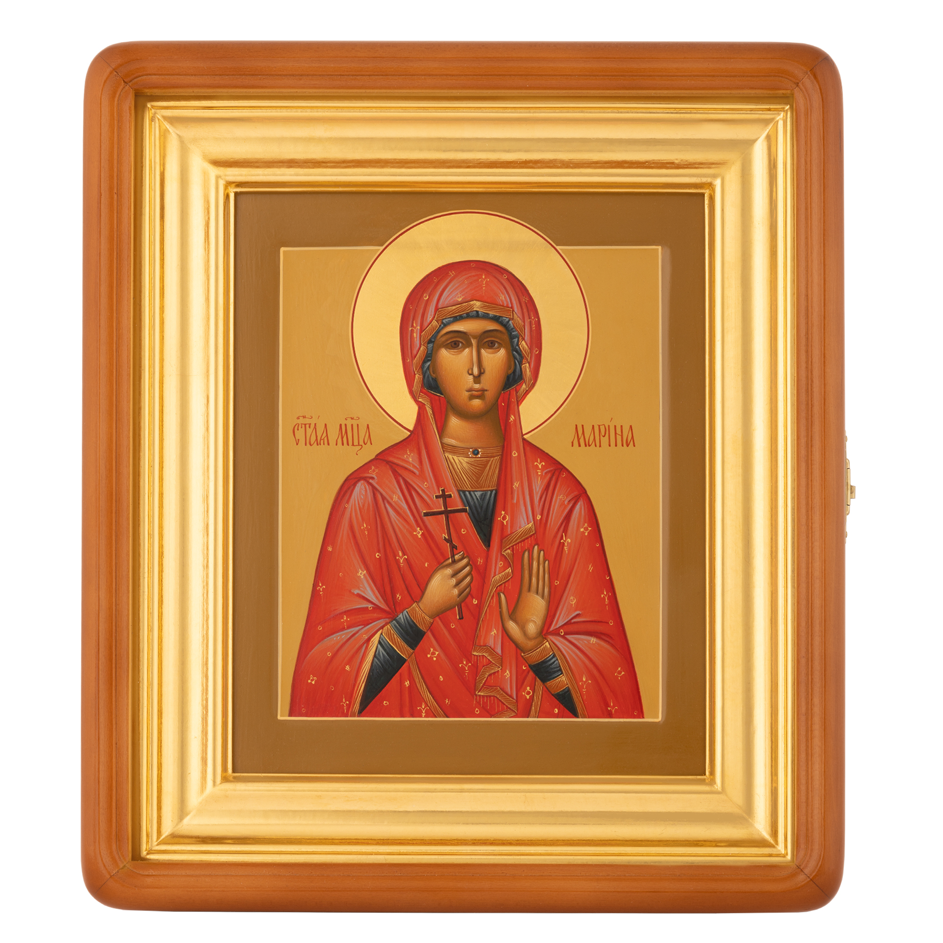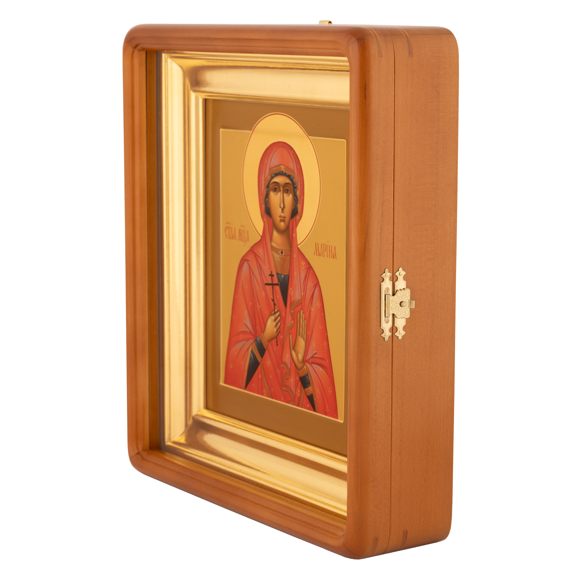Икона живописная на доске в киоте 18х24 темпера, золоченый нимб, ковчег, киот №1 Марина, 00614