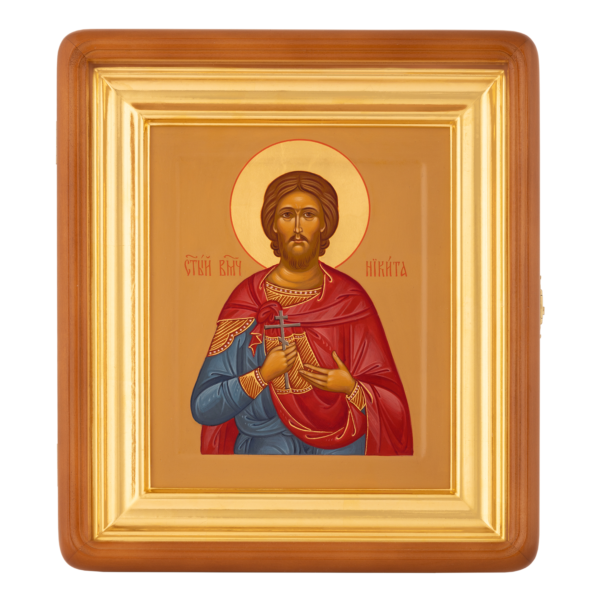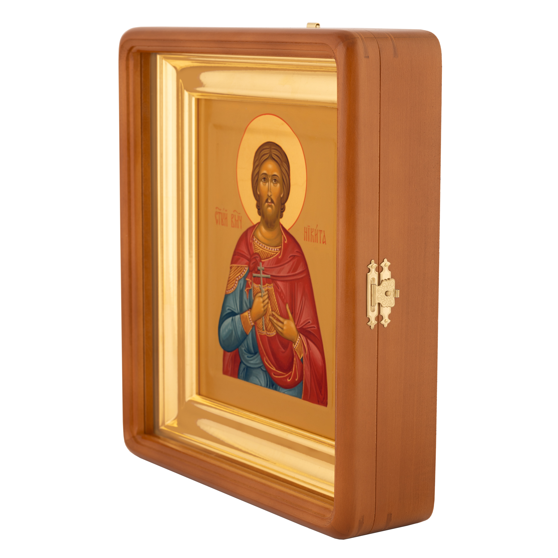 Икона живописная на доске в киоте 18х24 темпера, золоченый нимб, ковчег, киот №1 Никита, 00730