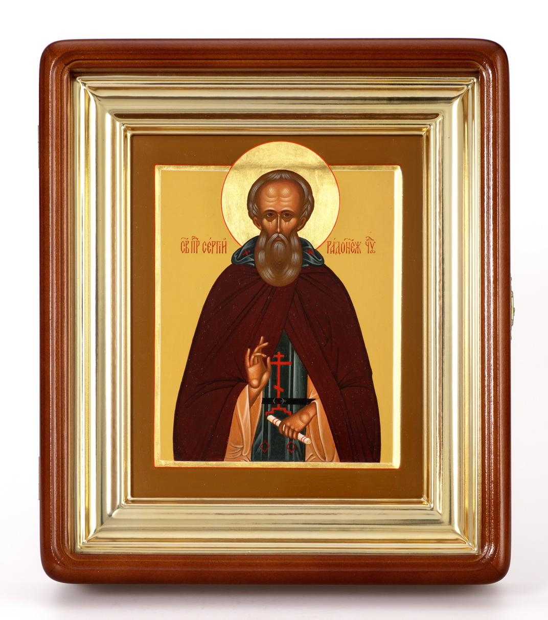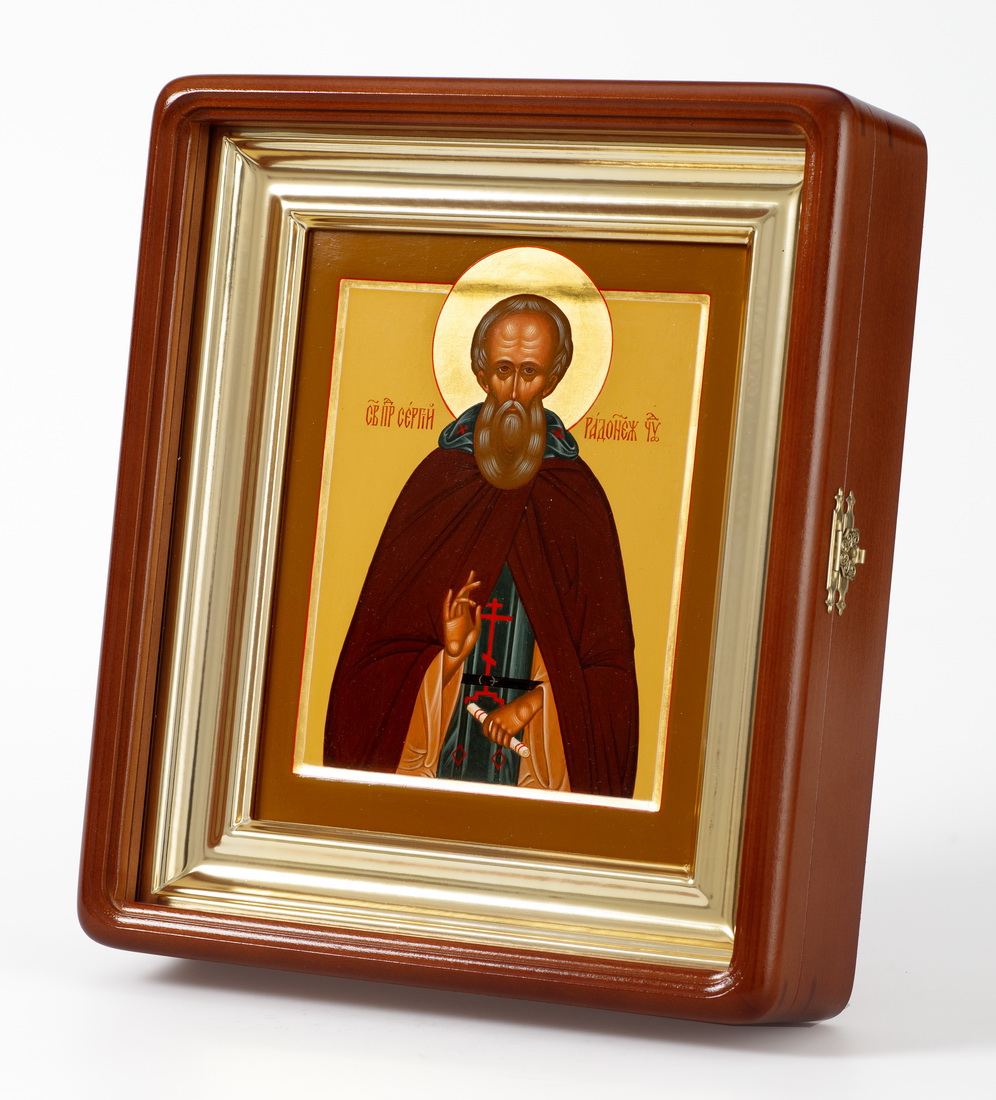 Икона живописная на доске в киоте 18х24 темпера, золоченый нимб, ковчег, киот №1 Сергий Радонежский