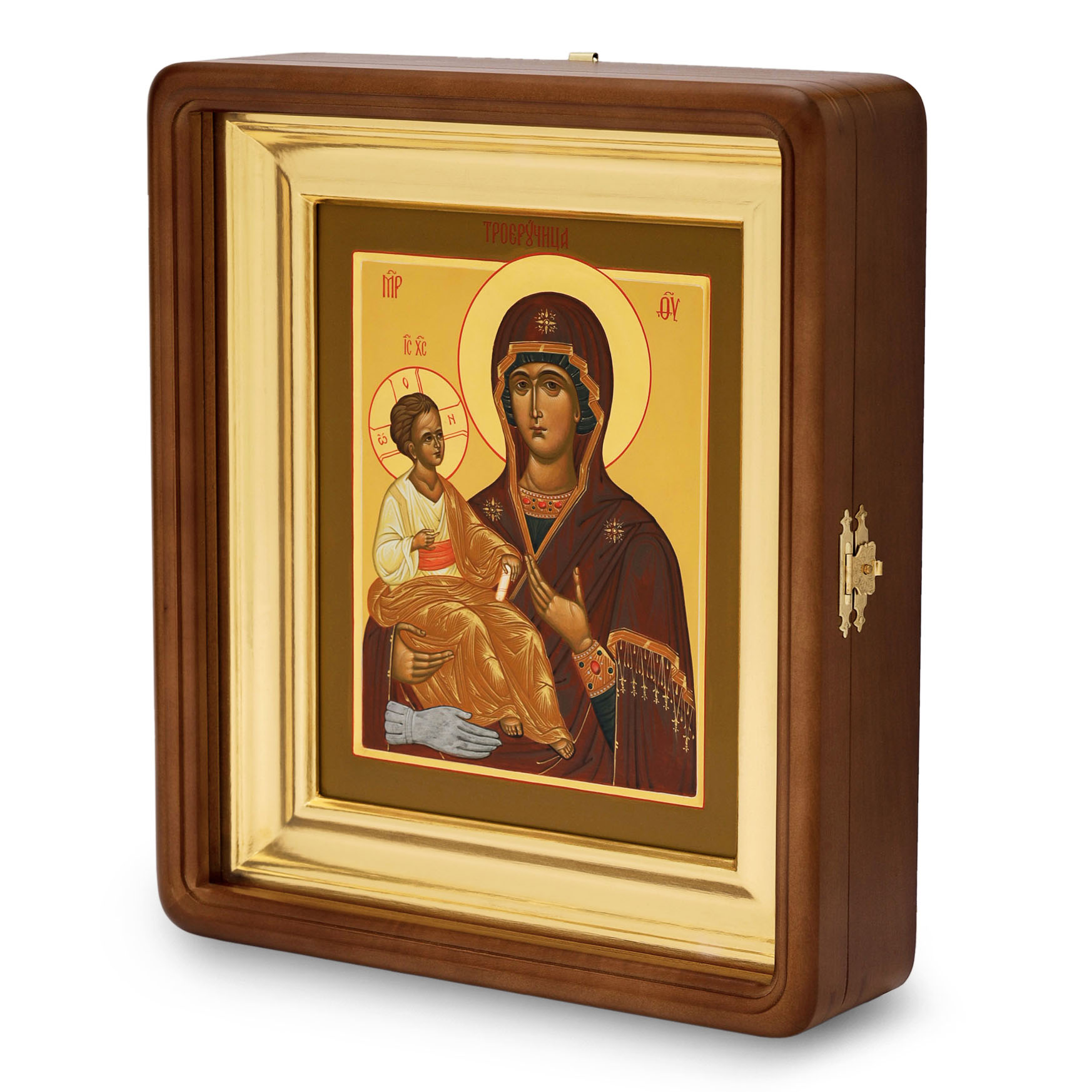 Икона живописная на доске в киоте 18х24 темпера, золоченый нимб, ковчег, киот №1 Троеручица