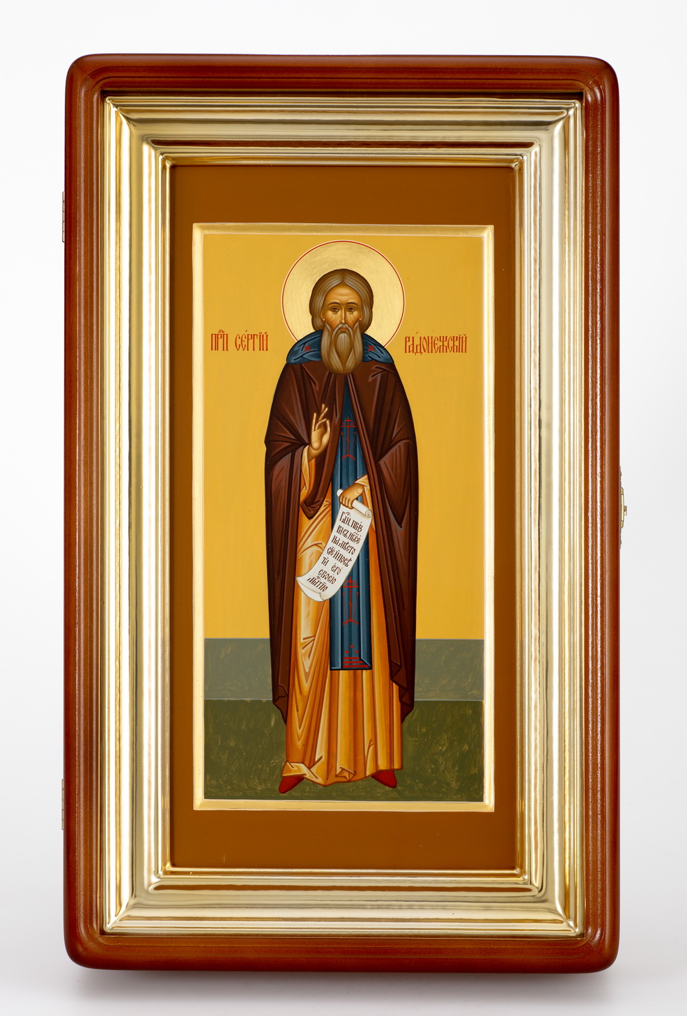Икона живописная на доске в киоте 18х36 темпера, золоченый нимб, ковчег, киот №1 Сергий Радонежский