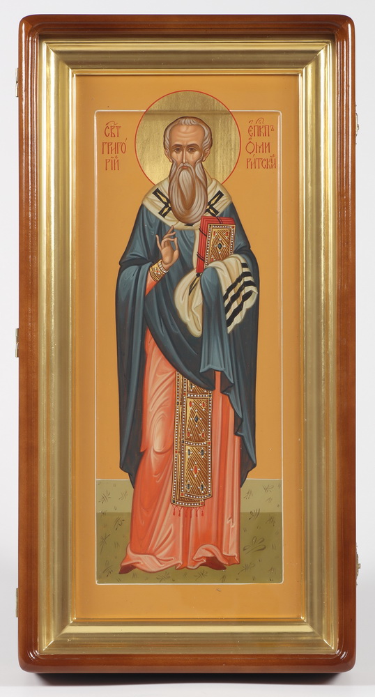 Икона живописная на доске в киоте 21х50 темпера, золоченый нимб, ковчег, киот №1 Григорий