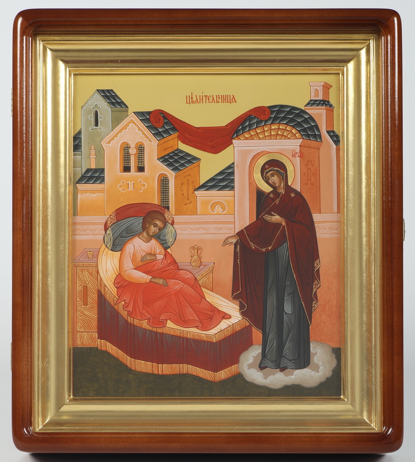 Икона живописная на доске в киоте 24х30 масло, золоченый нимб, киот №1 Целительница