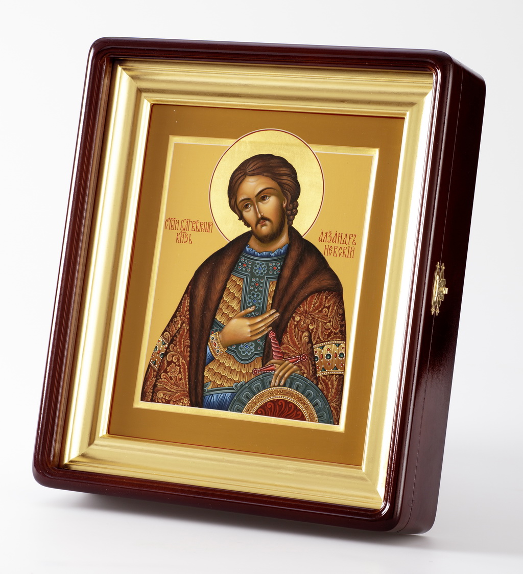 Икона живописная на доске в киоте 24х30 темпера, золоченый нимб, ковчег, киот №1 Александр Невский