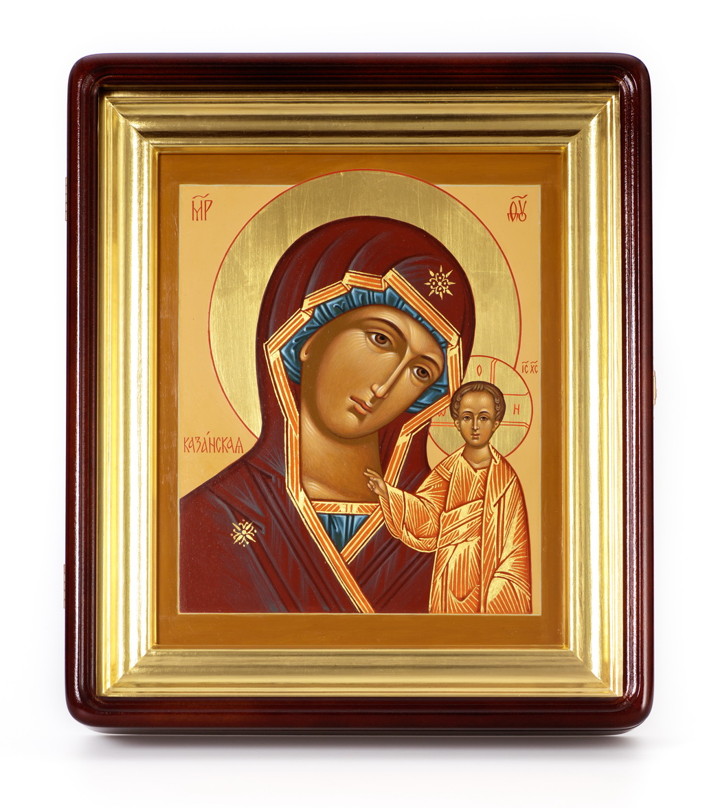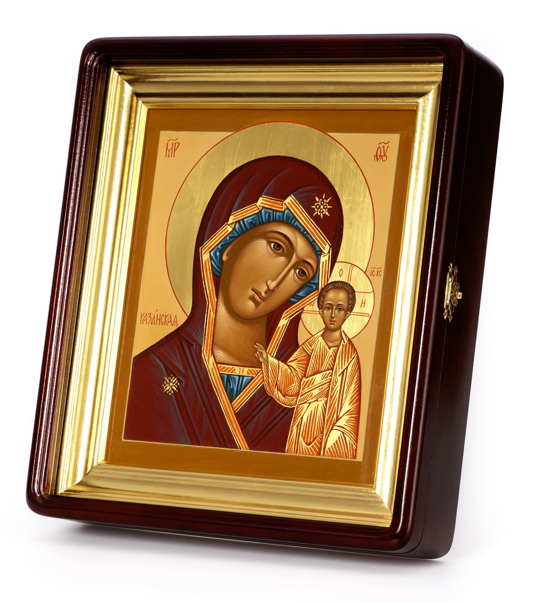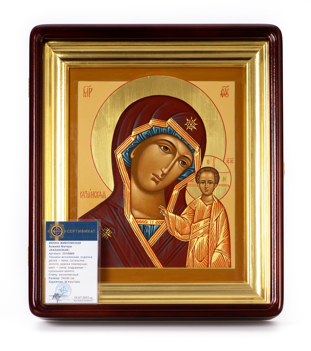 Икона живописная на доске в киоте 24х30 темпера, золоченый нимб, ковчег, киот №1 Казанская БМ