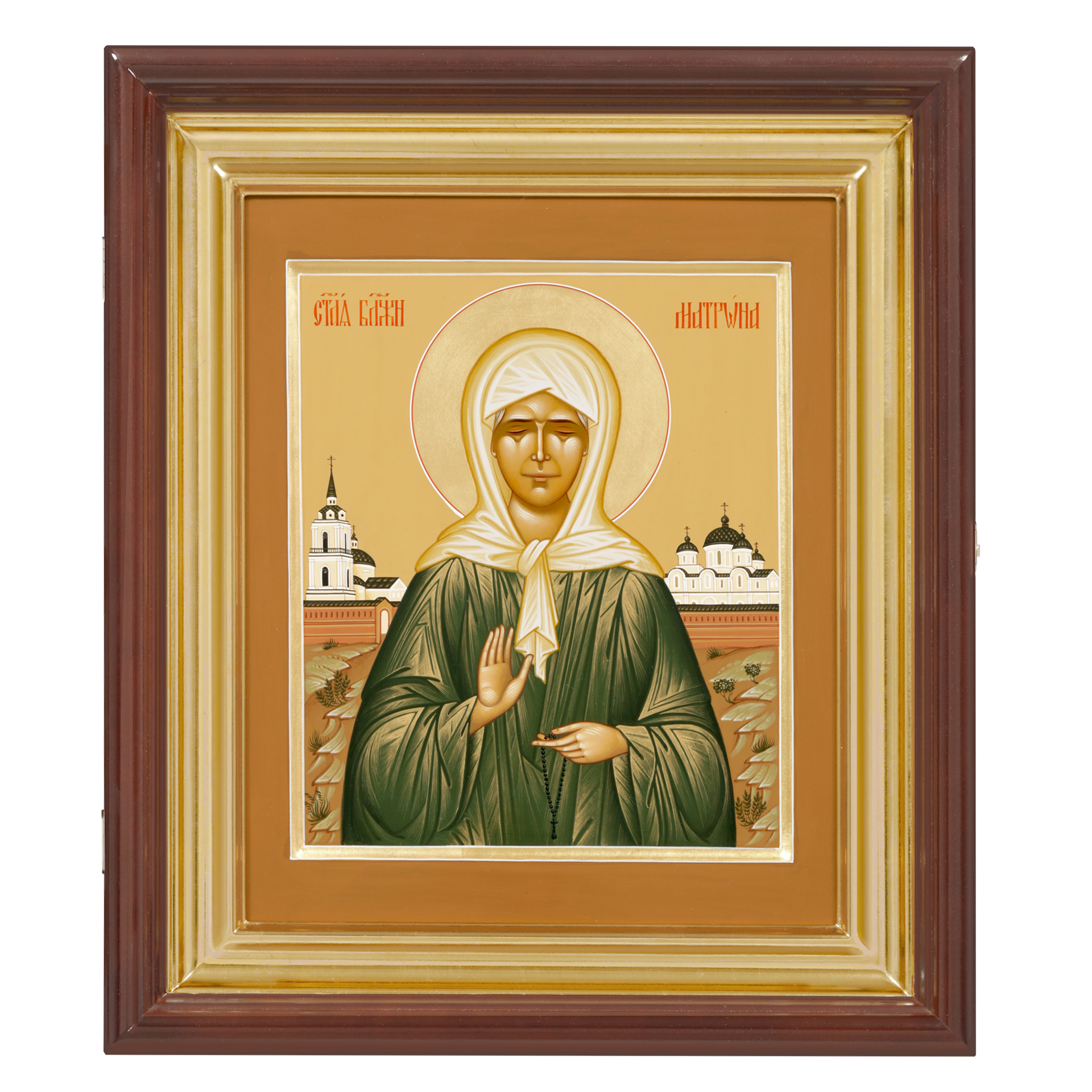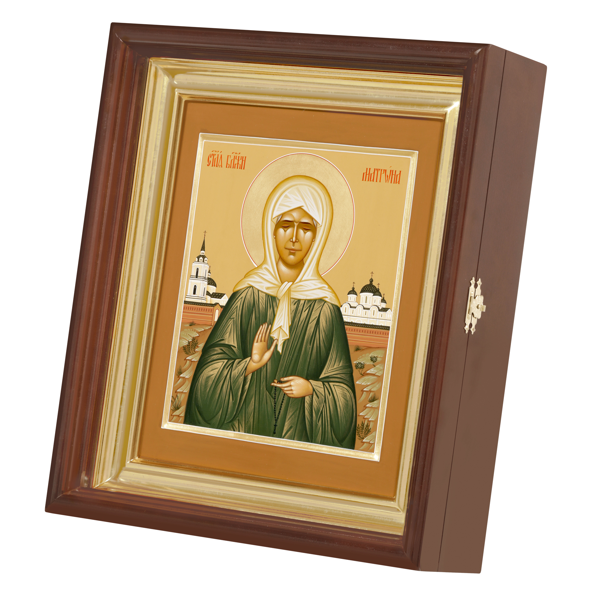 Икона живописная на доске в киоте 24х30 темпера, золоченый нимб, ковчег, киот №1 Матрона, 05632