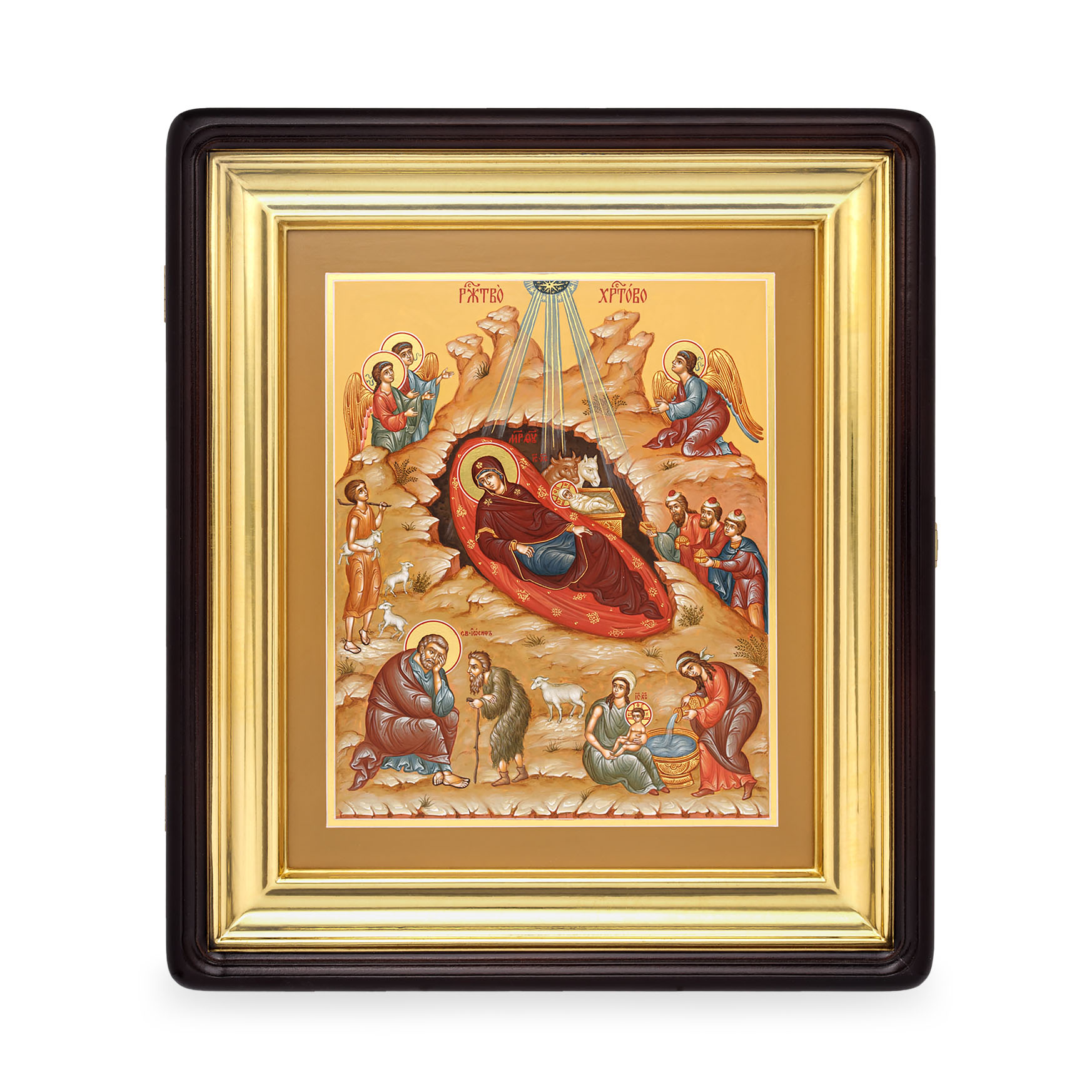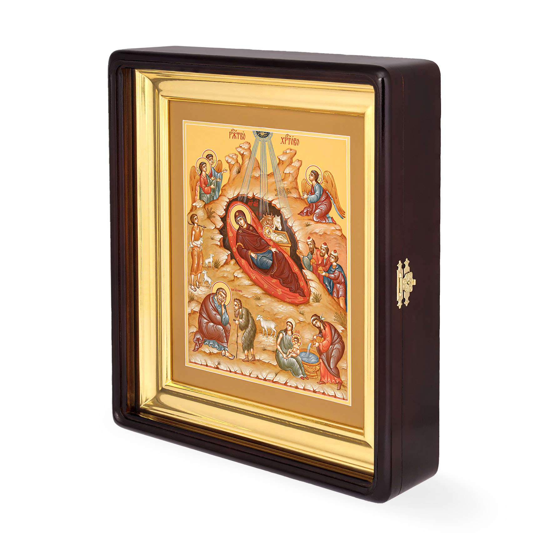 Икона живописная на доске в киоте 24х30 темпера, золоченый нимб, ковчег, киот №1 Рождество Христово, 02233