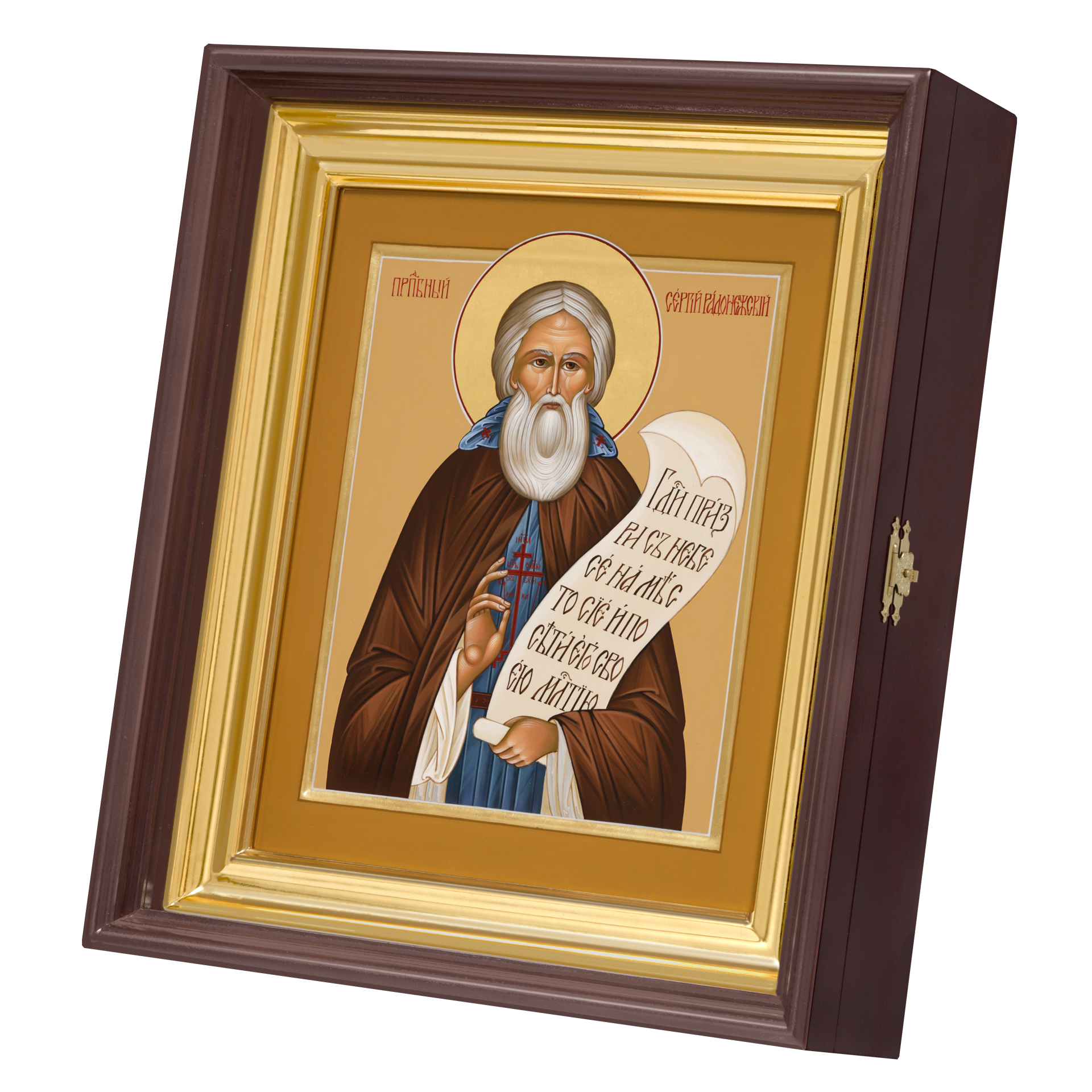 Икона живописная на доске в киоте 24х30 темпера, золоченый нимб, ковчег, киот №1 Сергий Радонежский, 05147