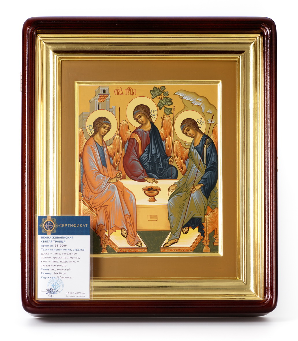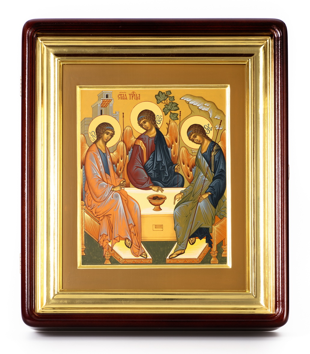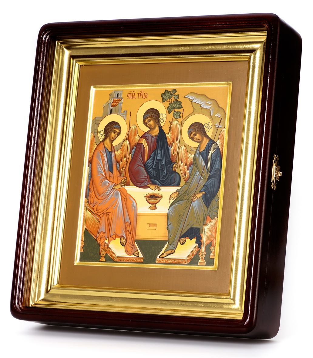 Икона живописная на доске в киоте 24х30 темпера, золоченый нимб, ковчег, киот №1 Троица (Рублевская)