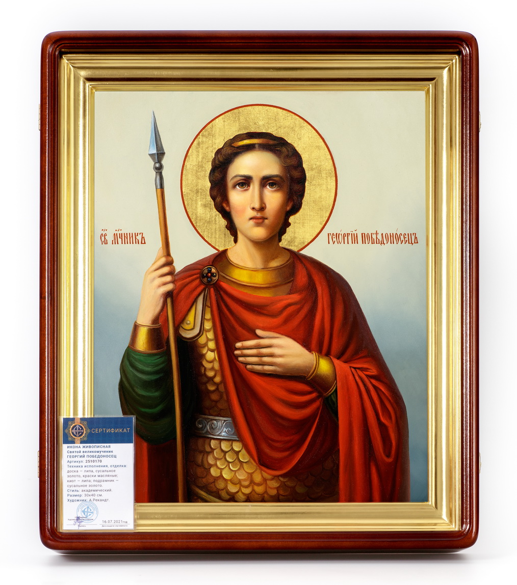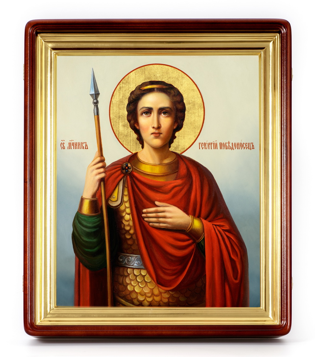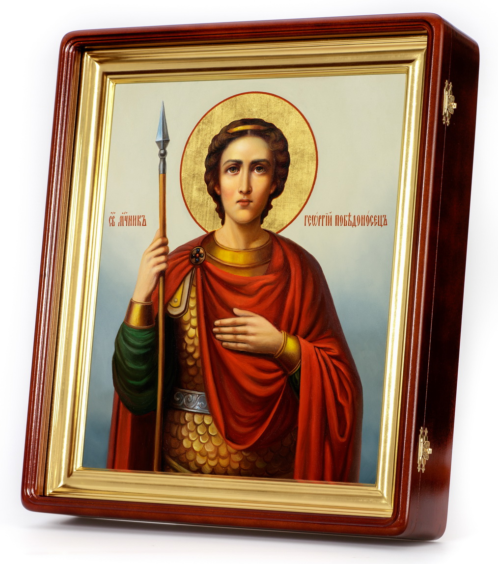 Икона живописная на доске в киоте 30х40 масло, золоченый нимб, киот №1 Георгий Победоносец