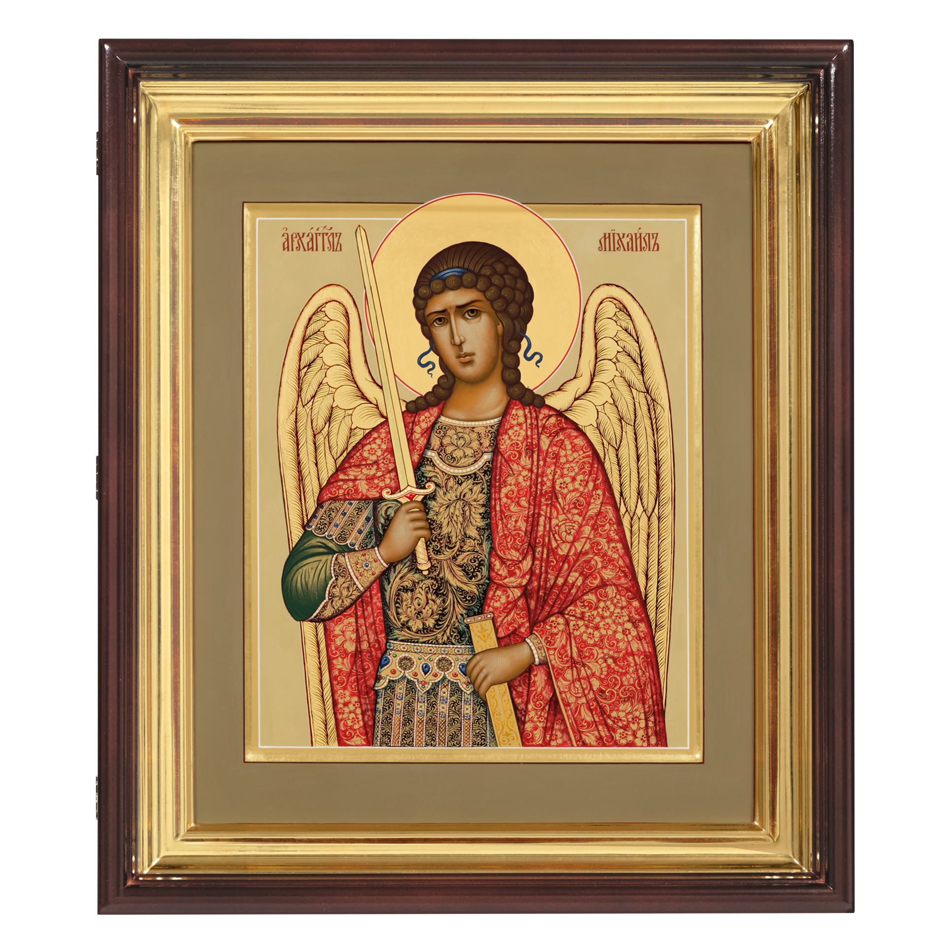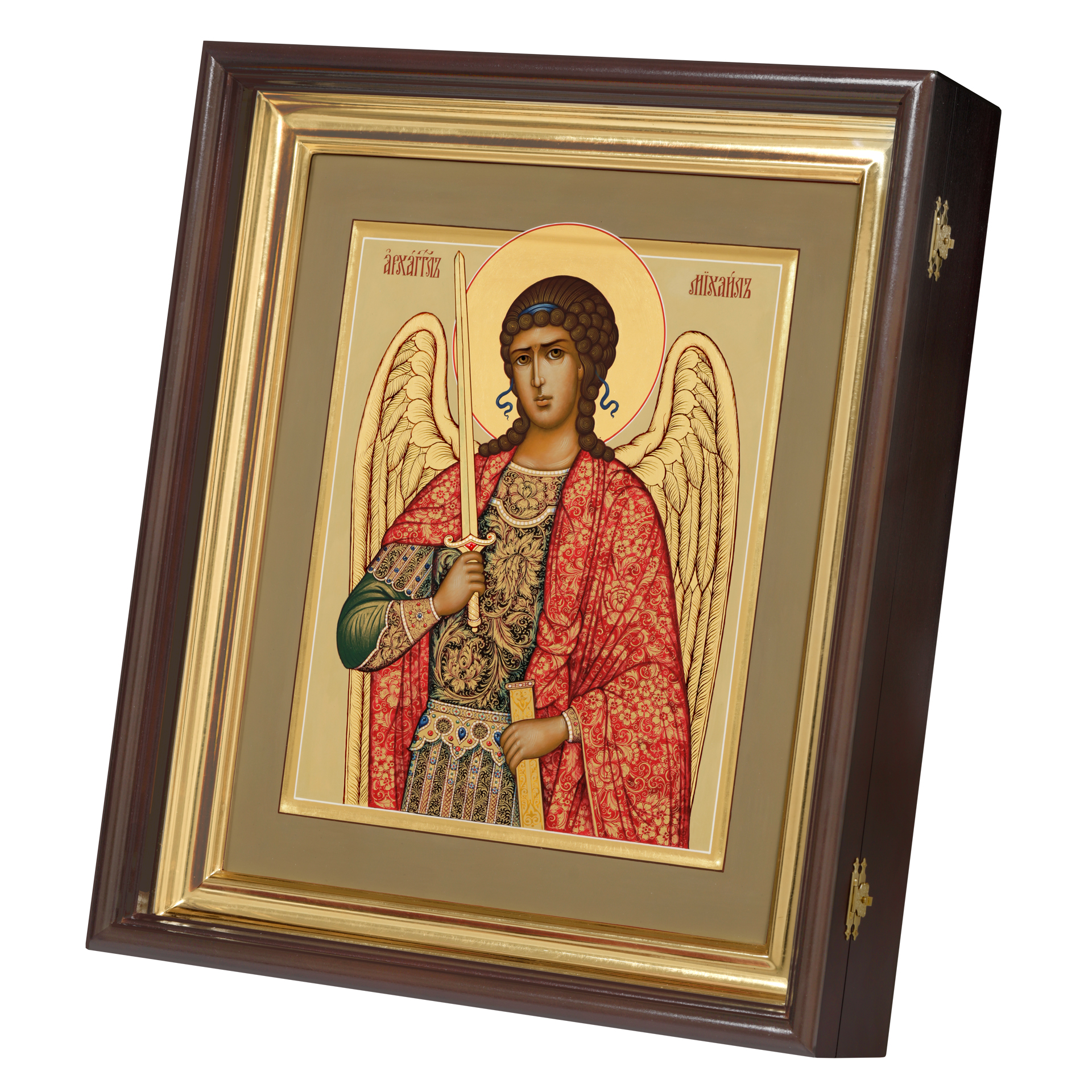 Икона живописная на доске в киоте 30х40 темпера, золоченый нимб, ковчег, киот №1 Архангел Михаил, 05600
