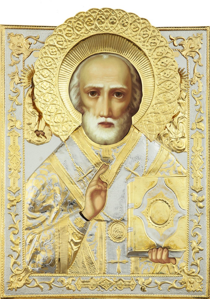 Риза изготавливается методом гальванопластики, из-за определенного техпроцесса все габариты и вес изделия могут отличаться. Икона написана на МДФ, которая покрыта левкасом. Риза изготовлена из меди, покрыта никелем и гальваническим золотом (комбинированное золочение). Тыльная сторона ризы обтянута бархатом. По желанию заказчика ризу можно сделать полностью золоченой или полностью покрытой никелем.