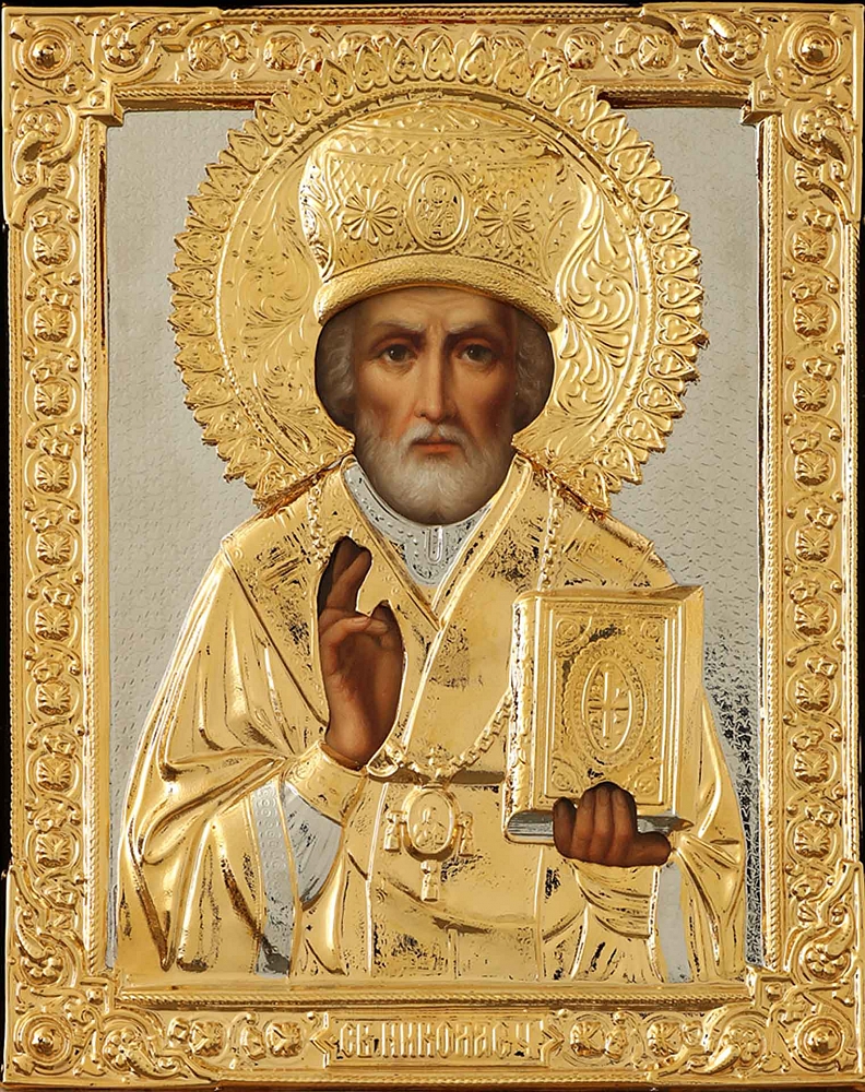 Риза изготавливается методом гальванопластики, из-за определенного техпроцесса все габариты и вес изделия могут отличаться. Икона написана на МДФ, которая покрыта левкасом. Риза изготовлена из меди, покрыта никелем и гальваническим золотом (комбинированное золочение). Тыльная сторона ризы обтянута бархатом. По желанию заказчика ризу можно сделать полностью золоченой или полностью покрытой никелем.