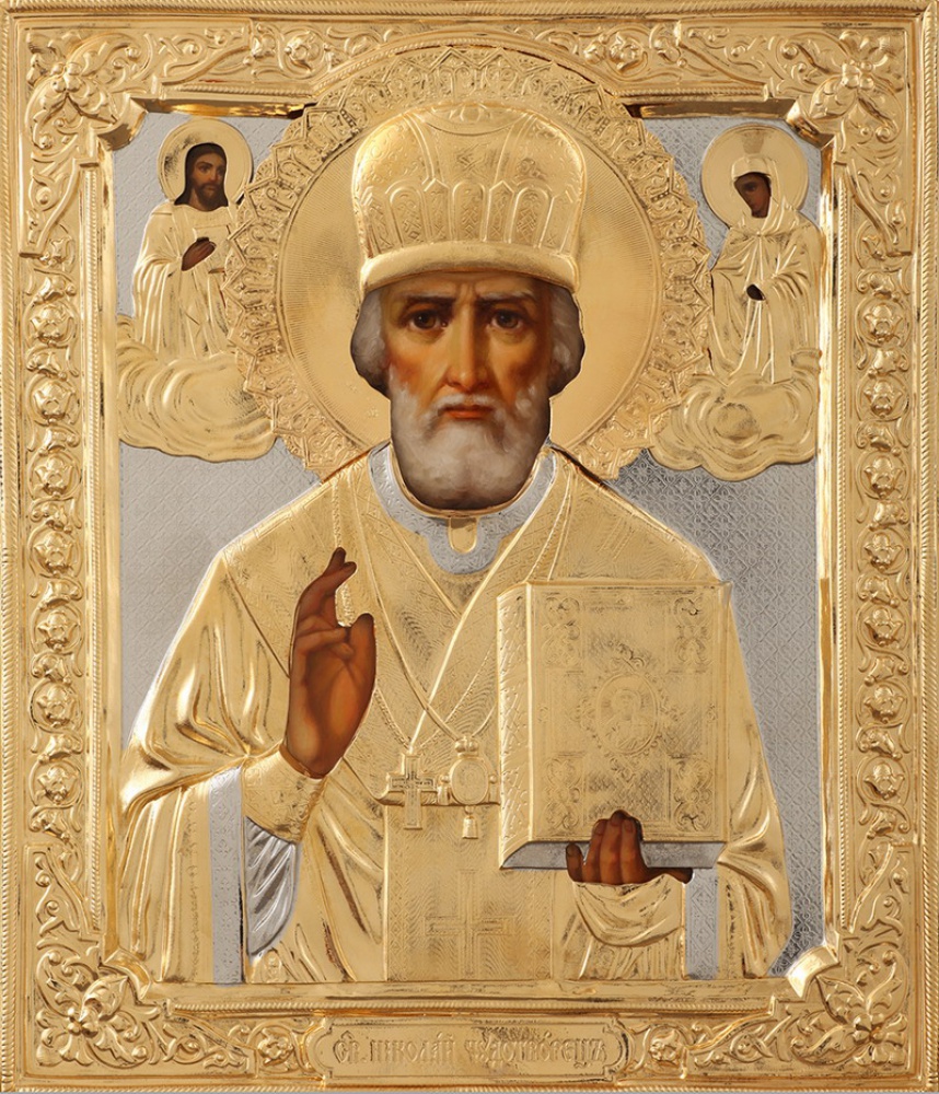 Риза изготавливается методом гальванопластики, из-за определенного техпроцесса все габариты и вес изделия могут отличаться. Икона написана на МДФ, которая покрыта левкасом. Риза изготовлена из меди, покрыта никелем и гальваническим золотом (комбинированное золочение). Тыльная сторона ризы обтянута бархатом. По желанию заказчика ризу можно сделать полностью золоченой или полностью покрытой никелем.
