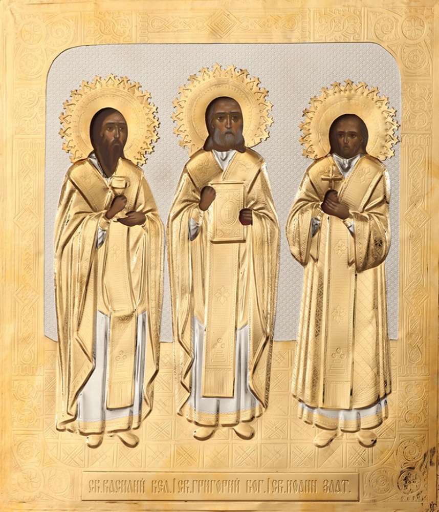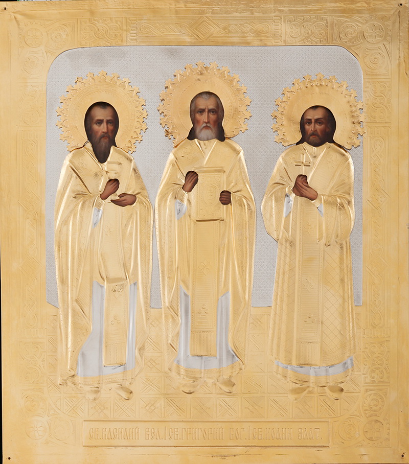 Икона живописная святителя Василия Великого, святителя Иоанна Златоуста, святителя Григория Богослова