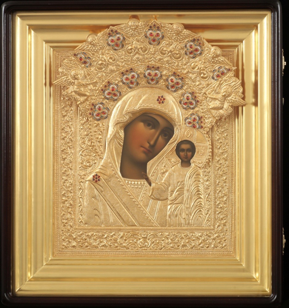 Икона живописная в гальванопластической ризе 40*50 серебро / киот / Казанская БМ (УИН)