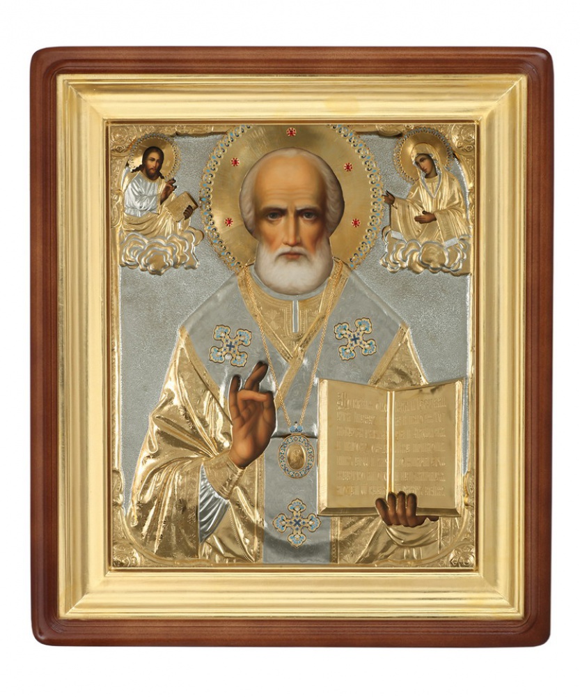 Икона живописная в киоте 100х120 масло, риза №167 эмаль, камни, киот №1 Николай Чудотворец