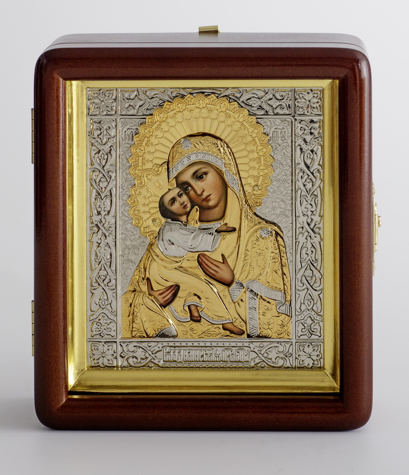 Икона живописная в киоте 11х13 масло, риза штампованная, латунь, частичное золочение, киот №1 Владимирская БМ