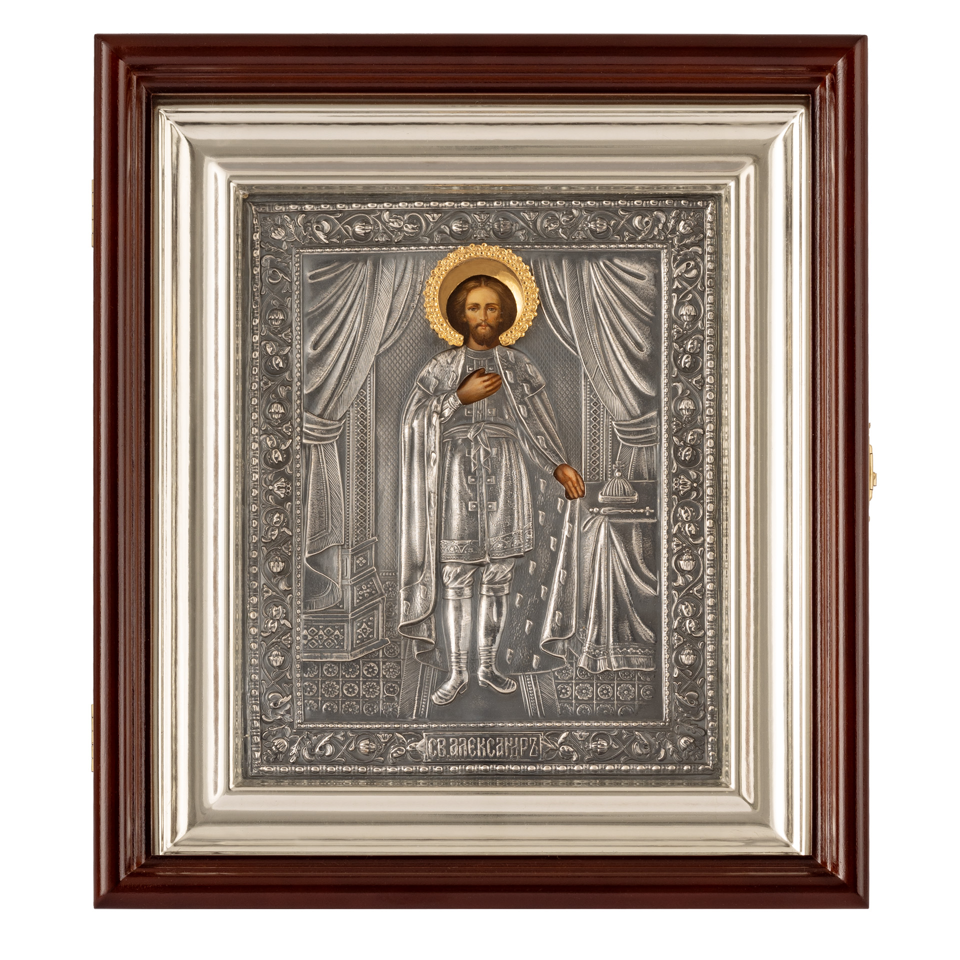 Икона живописная в киоте 18х24 масло, риза №117, черненое серебрение, киот №1 Александр Невский