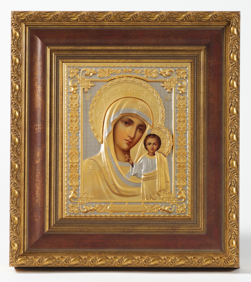 Риза изготавливается методом гальванопластики. В связи с техпроцессом габариты и вес изделия могут отличаться. Икона написана на МДФ покрытой левкасом. Риза изготовлена из меди, покрыта никелем и гальваническим золотом (комбинированное матовое золочение). Киот и подрамник изготавливается из багета.