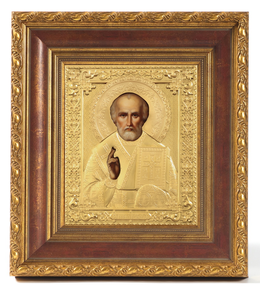 Риза изготавливается методом гальванопластики. В связи с техпроцессом габариты и вес изделия могут отличаться. Икона написана на МДФ покрытой левкасом. Риза изготовлена из меди, покрыта никелем и гальваническим золотом (комбинированное матовое глянцевое золочение). Киот и подрамник изготавливается из багета.