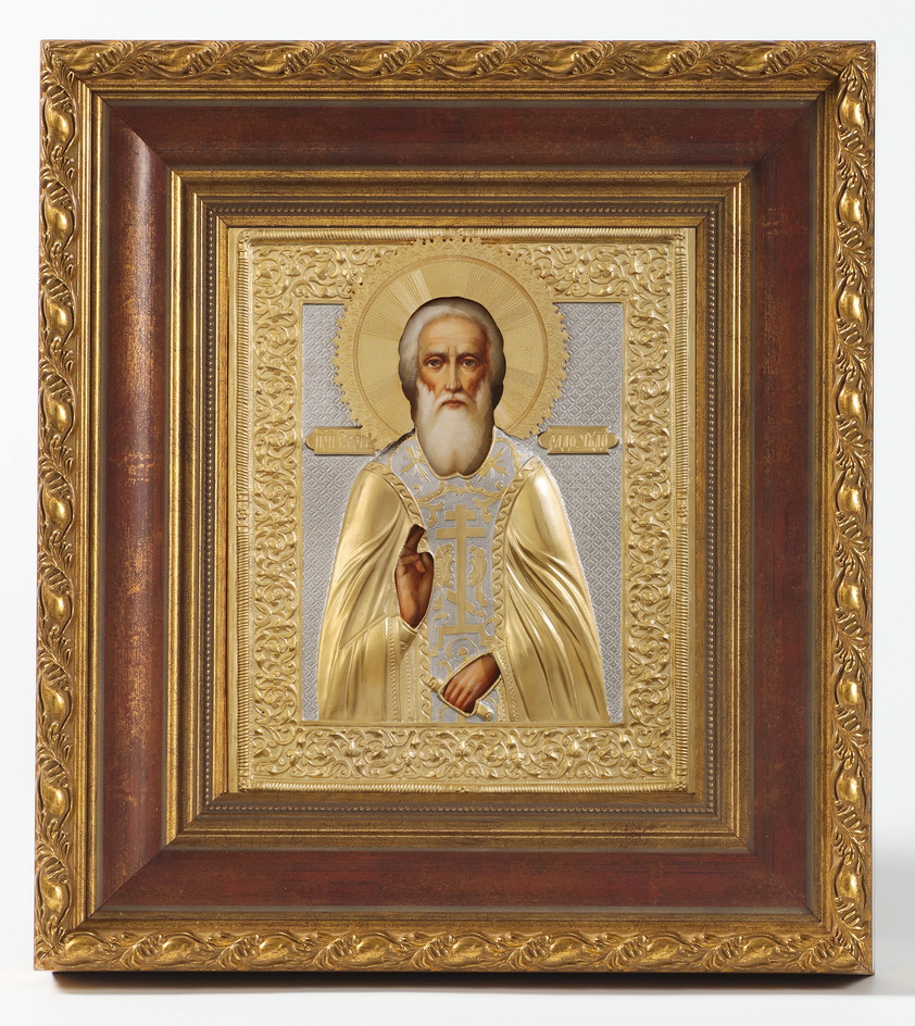 Риза изготавливается методом гальванопластики. В связи с техпроцессом габариты и вес изделия могут отличаться. Икона написана на МДФ покрытой левкасом. Риза изготовлена из меди, покрыта никелем и гальваническим золотом (комбинированное матовое золочение). Киот и подрамник изготавливается из багета.