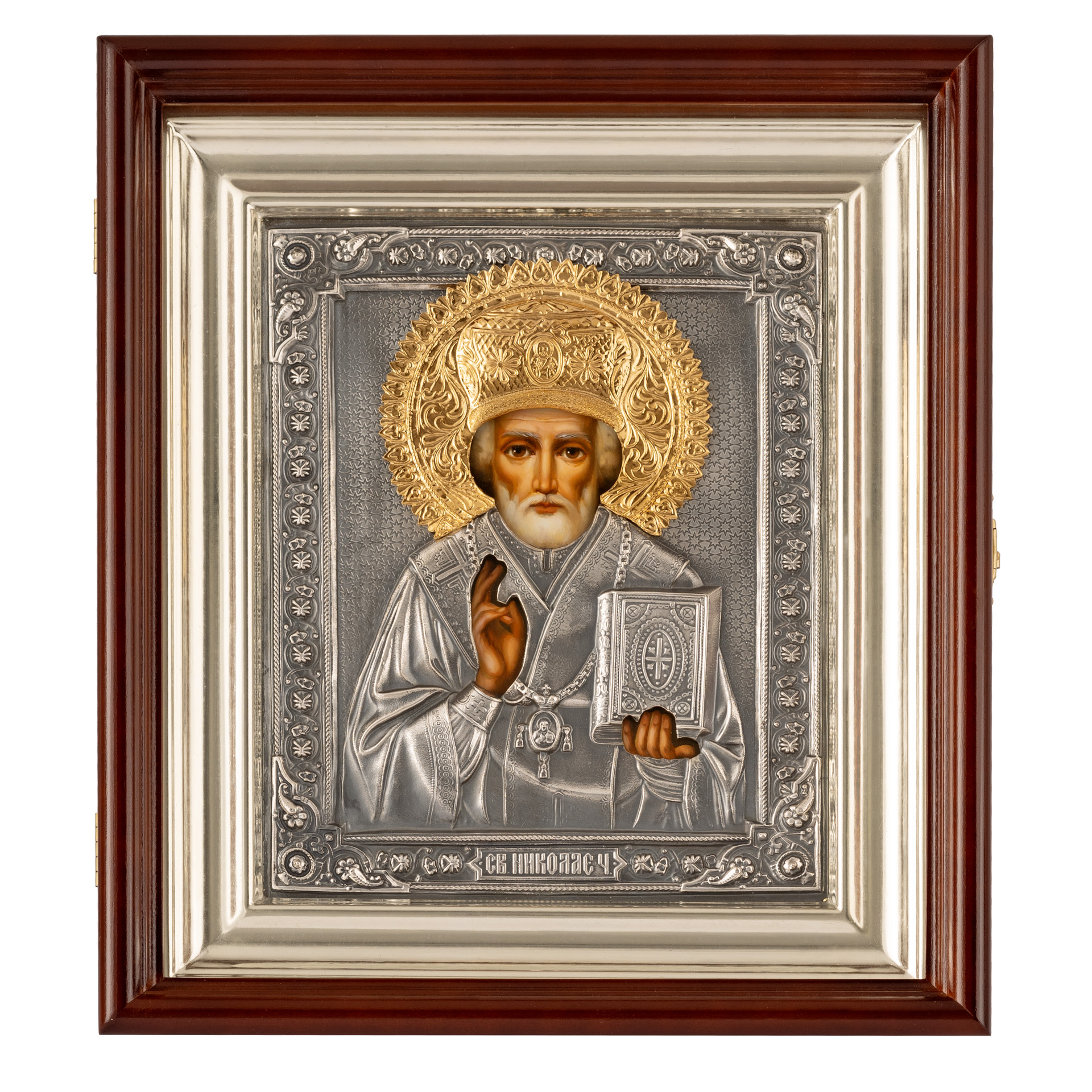Икона живописная в киоте 18х24 масло, риза №51, черненое серебрение, киот №1 Николай Чудотворец