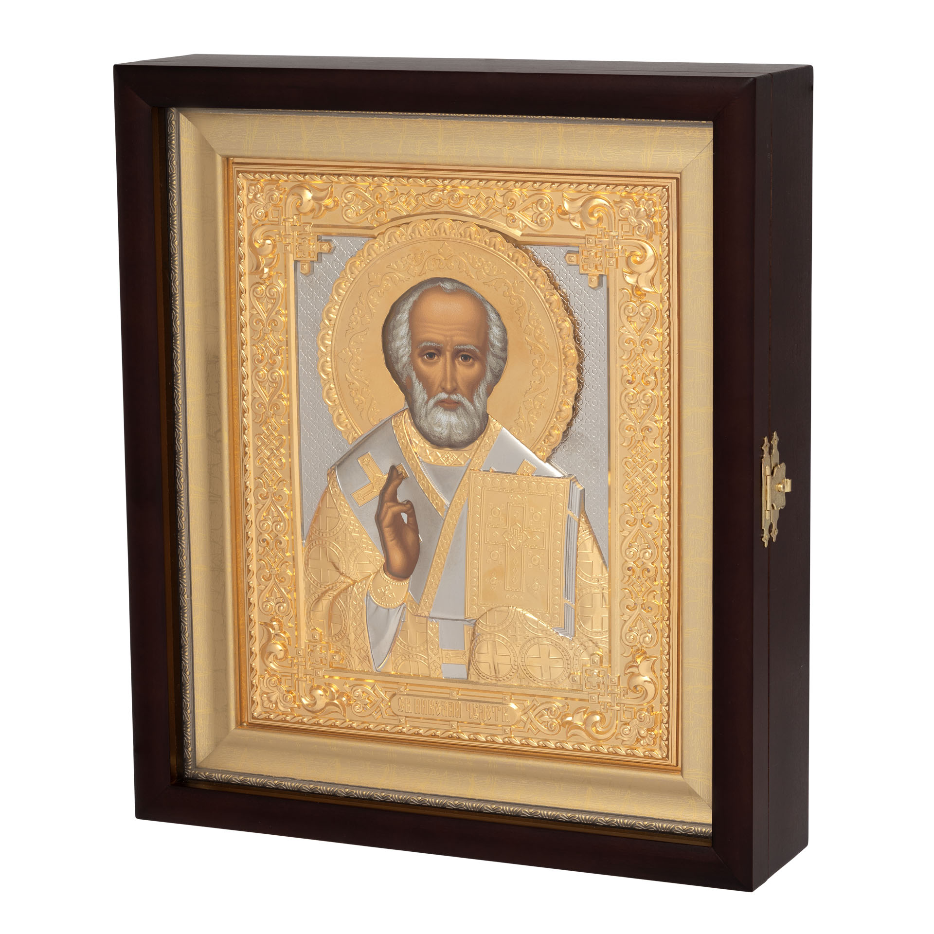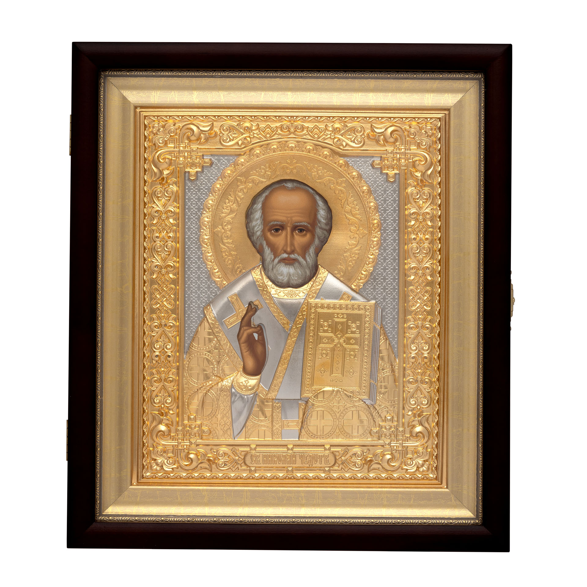 Икона живописная в киоте 18х24 темпера, риза №243-1 част / золочёная, багетный подрамник Николай Чудотворец