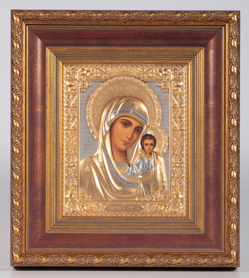 Икона живописная в киоте 18х24 темпера, риза №244 част / золочёная, багетный подрамник и рубашка Казанская БМ