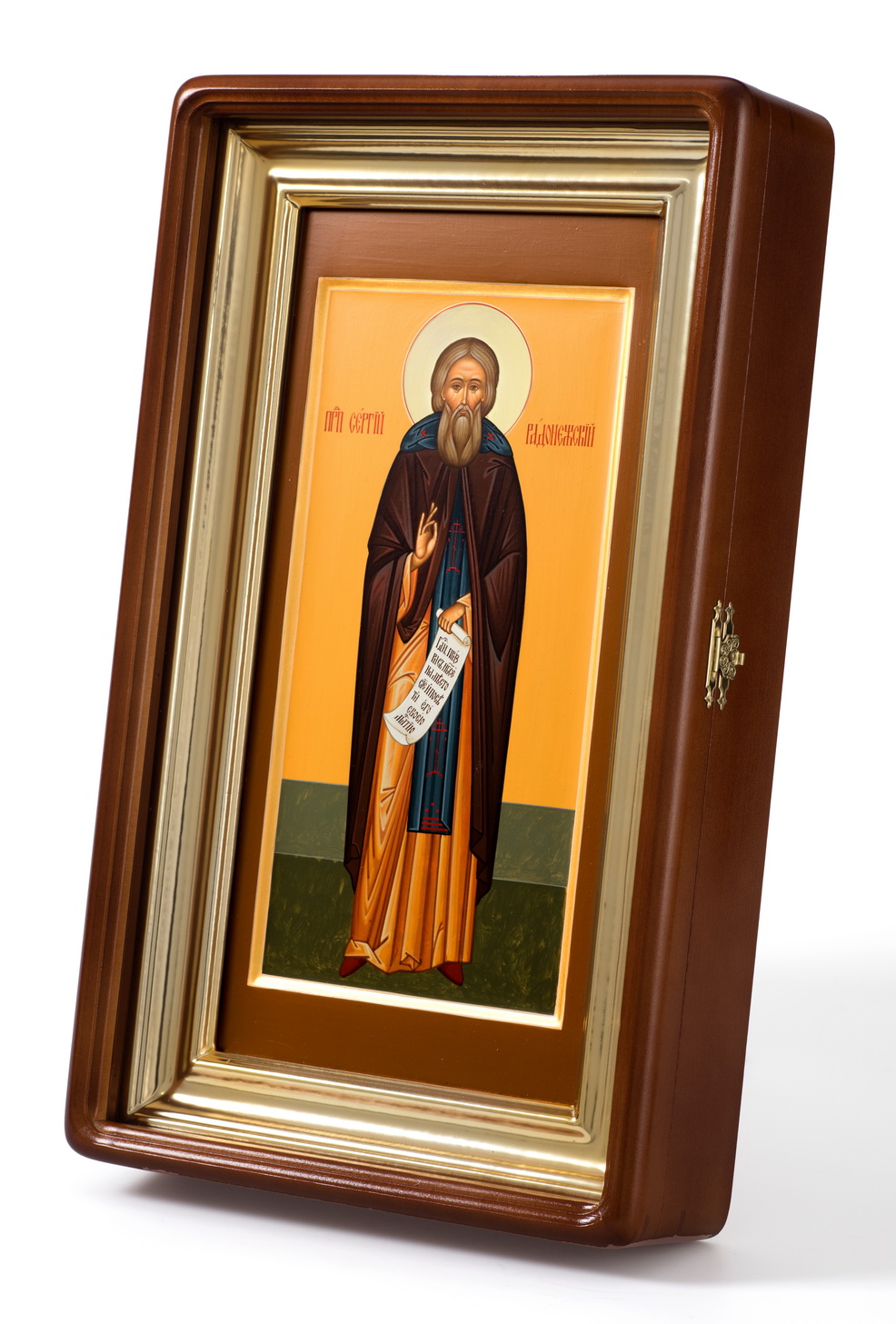 Икона живописная на доске в киоте 18х36 темпера, золоченый нимб, ковчег, киот №1 Сергий Радонежский