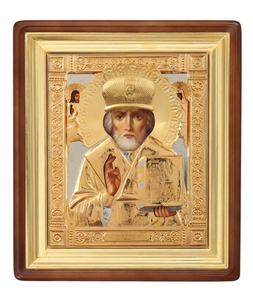 Риза изготавливается методом гальванопластики. В связи с техпроцессом габариты и вес изделия могут отличаться. Икона написана на МДФ покрытой левкасом. Риза изготовлена из меди, покрыта никелем и гальваническим золотом (комбинированное золочение).