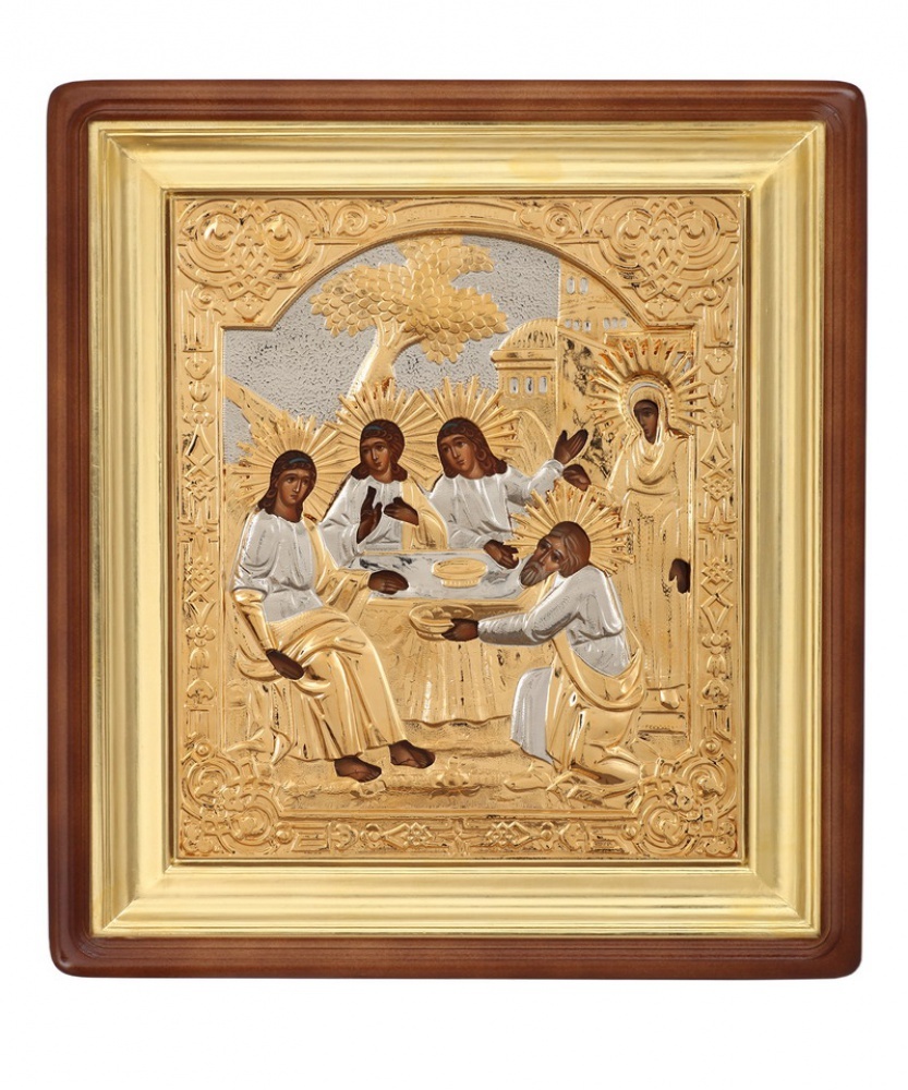 Риза изготавливается методом гальванопластики. В связи с техпроцессом габариты и вес изделия могут отличаться. Икона написана на МДФ покрытой левкасом. Риза изготовлена из меди, покрыта никелем и гальваническим золотом (комбинированное золочение).