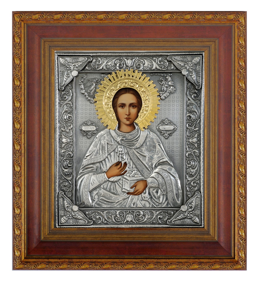 Икона живописная в киоте 24х30 масло, риза №132, черненое серебрение, киот №22 Пантелеимон