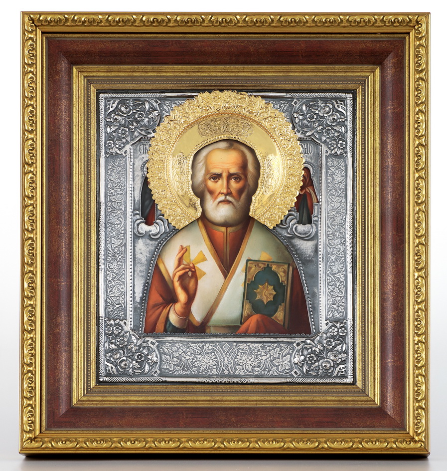 Икона живописная в киоте 24х30 масло, риза №227, черненое серебрение, киот №22 Николай Чудотворец