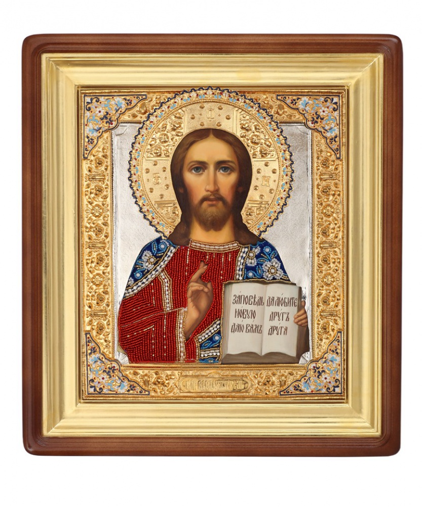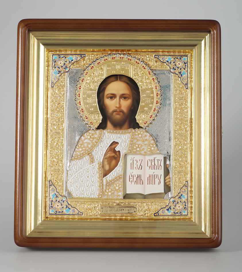 Икона живописная в киоте 24х30 масло, риза №24, эмаль, жемчуг, киот №1 Спаситель