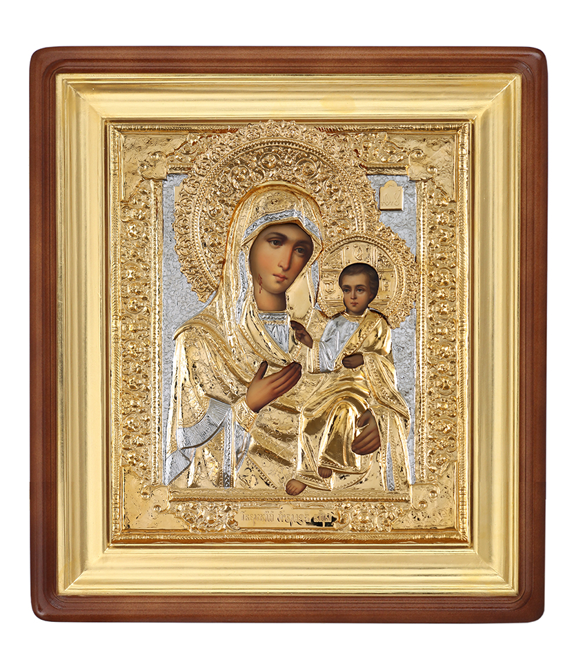 Риза изготавливается методом гальванопластики. В связи с техпроцессом габариты и вес изделия могут отличаться. Икона написана на МДФ покрытой левкасом. Риза изготовлена из меди, покрыта никелем и гальваническим золотом (комбинированное золочение).