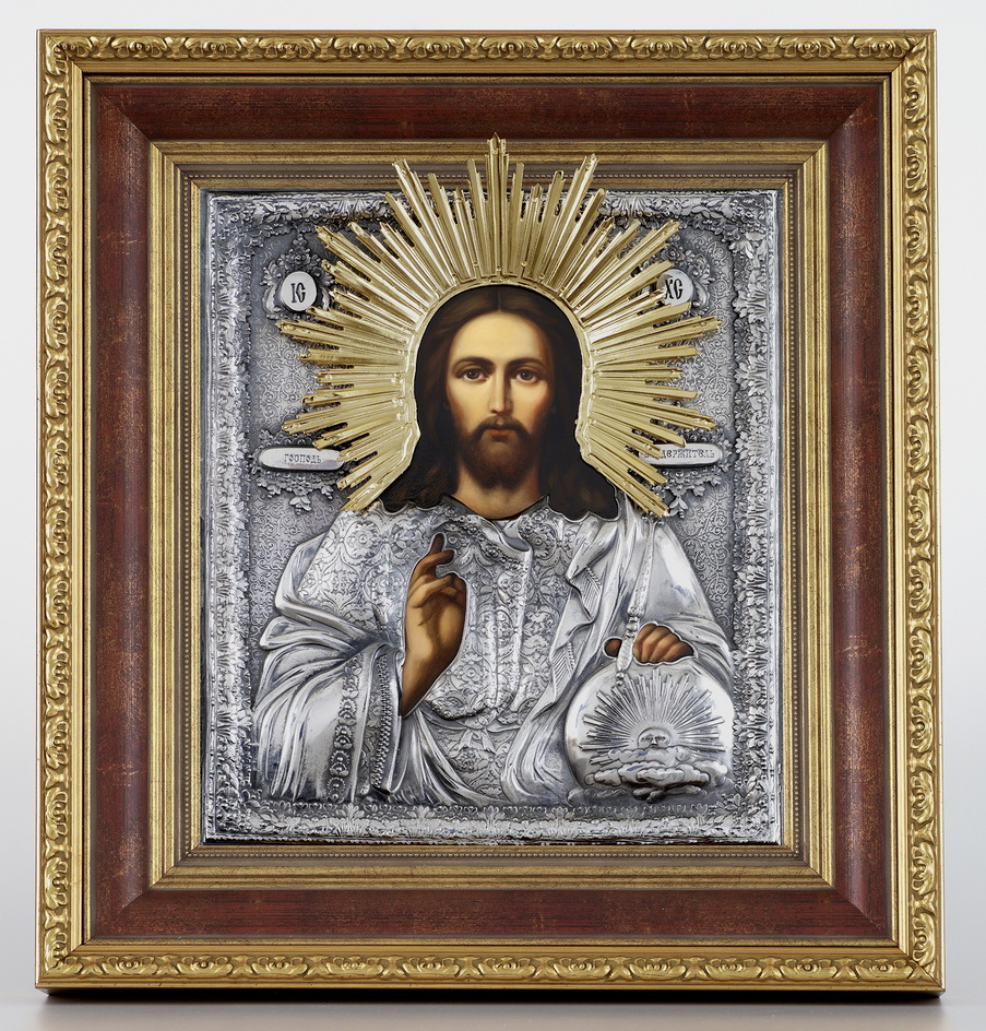 Икона живописная в киоте 24х30 масло, риза №96, черненое серебрение, киот №22 Спаситель